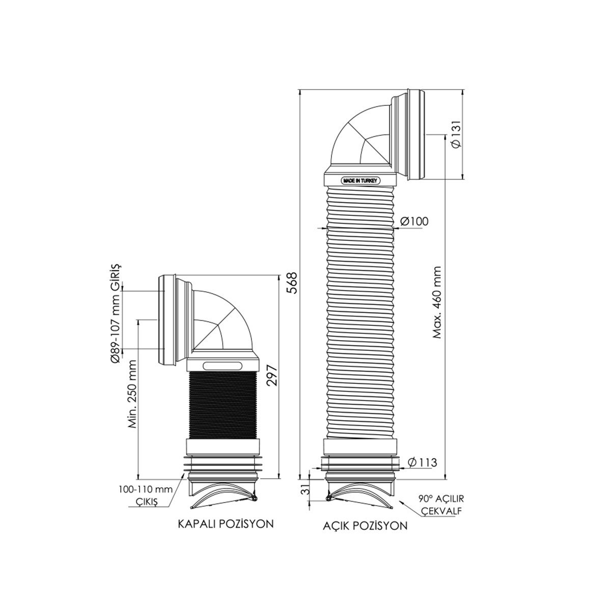 Arkadan çıkışlı klozetlerin yerden çıkışlı pis su tesisatına bağlanmasını sağlar. Körüklü ve esnek yapısı sayesinde, duvara sıfır bağlantı ve eksen kaçırmayı mümkün kılar. Çekvalf sayesinde kötü koku ve haşere girişini engeller.