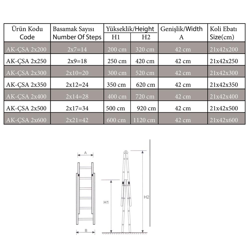 Akrobat A Tipi Çift Sürgülü Alüminyum Merdiven 2X350 Cm," her biri 3,5 metre uzunluğunda olan iki parça ile toplamda 7 metreye kadar uzanabilen, çift sürgülü A tipi bir