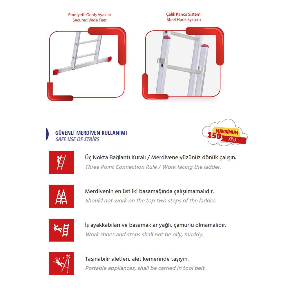 Çift Sürgülü Tasarım: Hem üst hem de alt parçaların ayrı ayrı uzatılabilir olması, merdivenin uzunluğunu ihtiyaca göre ayarlamanıza olanak tanır.