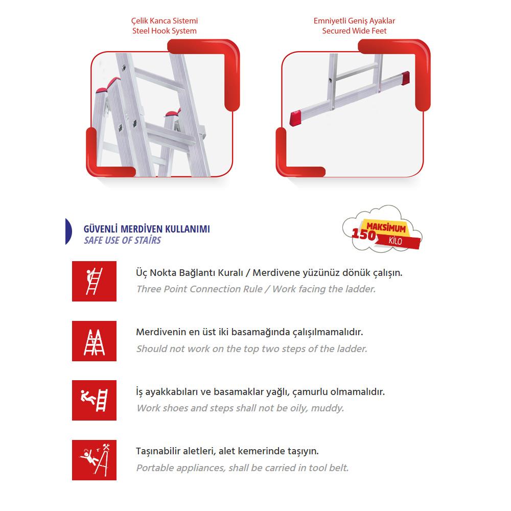 Güvenlik Özellikleri: Kaymaz basamaklar, güvenlik kilitleri ve geniş ayak yapıları ile güvenli kullanım sunar.