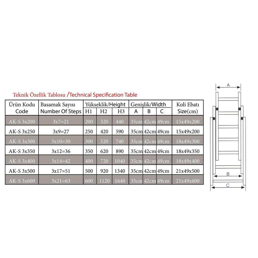 Akrobat Üç Parçalı Sürgülü Alüminyum Merdiven 3X350 Cm," 3,5 metre uzunluğunda ve üç parçalı sürgülü yapıya sahip profesyonel bir alüminyum merdivendir. Bu tür