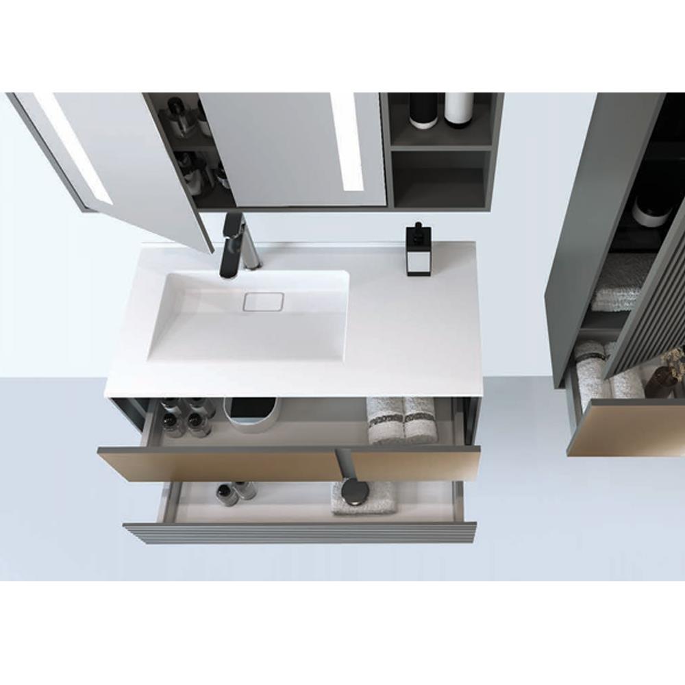 Aquanil Boneta 100 cm banyo dolabı, modern ve şık tasarımıyla banyonuzu güzelleştirir. Antrasit rengi, banyonuza sofistike ve zarif bir görünüm kazandırırken, geniş depolama