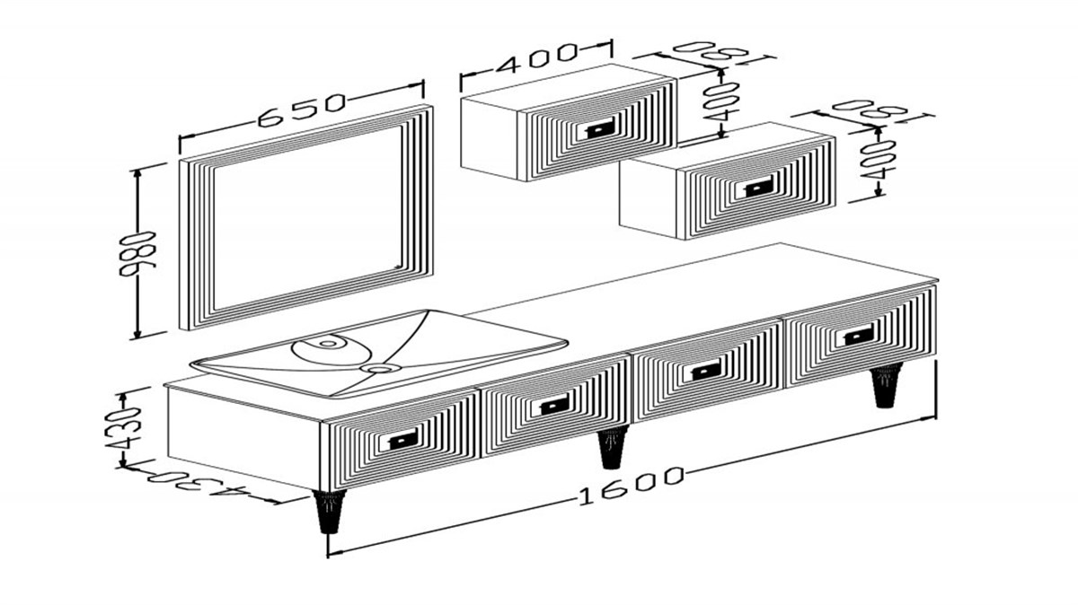Alt modül: En 160 cm Derinlik 43 cm Yükseklik 82,50 cm (iki çekmece, iki kapak)