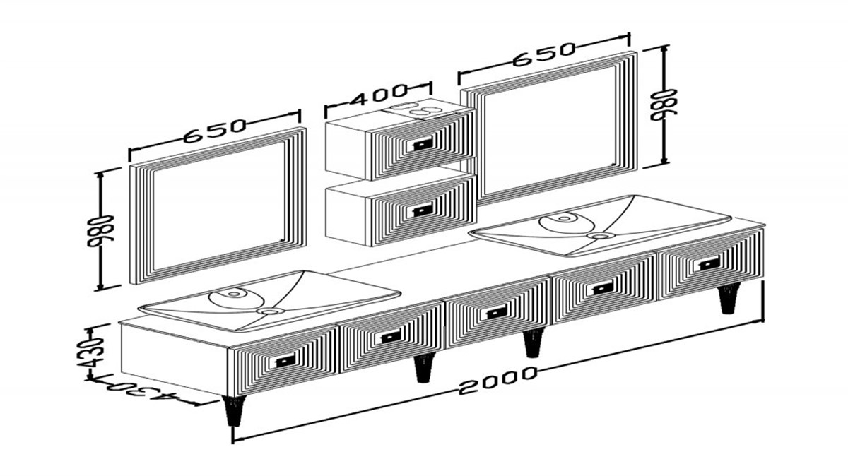 Alt modül: En 200 cm Derinlik 43 cm Yükseklik 82,50 cm (bir çekmece, dört kapak)