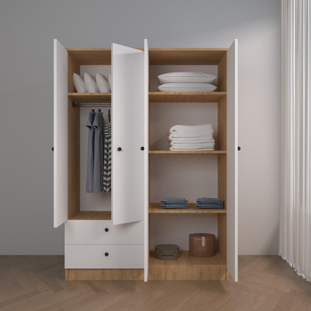 sahip bu dolap, geniş iç hacmi sayesinde kıyafet, çarşaf, havlu ve çeşitli kişisel eşyaların düzenli biçimde saklanmasına olanak tanır.