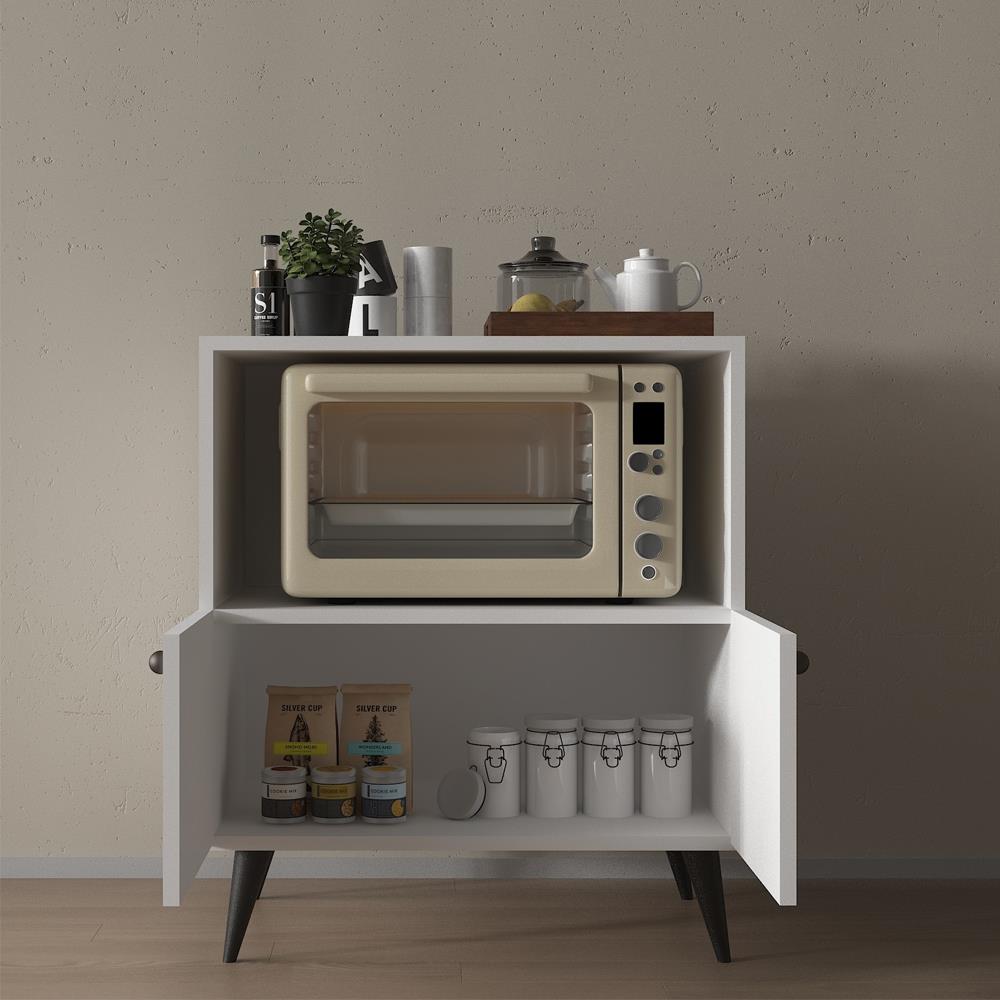 Üst bölüm, mikrodalga fırının rahatça yerleştirilebileceği ideal yükseklikte ve genişliktedir. Alt ve üst bölmeler ise küçük mutfak eşyaları, kuru gıdalar ya da servis malzemeleri için
