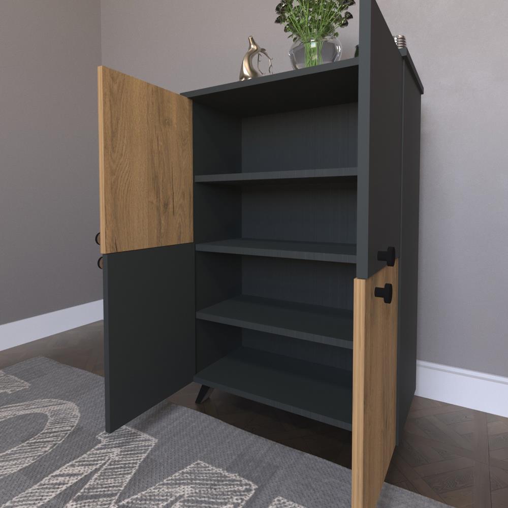 levhadan, diğer iki kapağı ise doğal dokulu atlantik çam melamin kaplı yonga levhadan üretilmiştir. Bu renk uyumu sayesinde estetik ve sıcak bir görünüm sağlar.