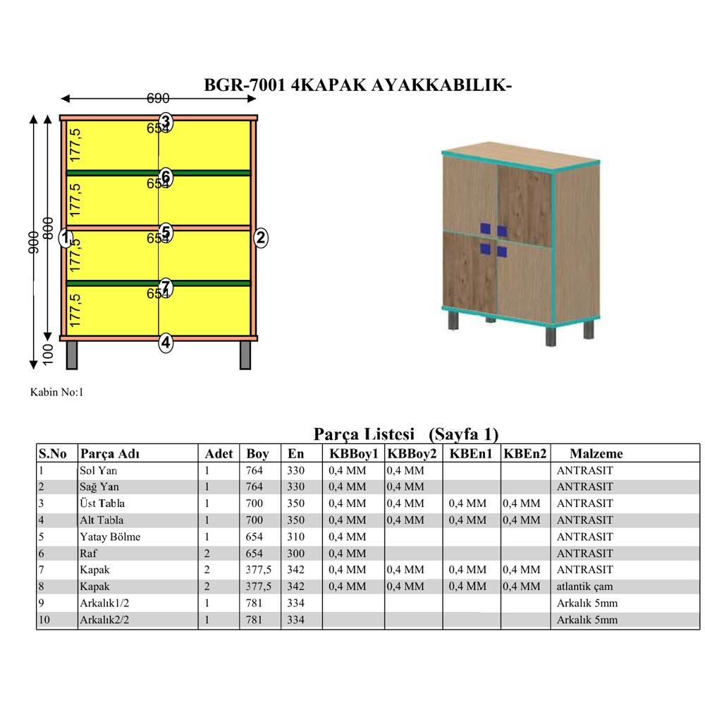 Kapaklar: 2 adet antrasit, 2 adet atlantik çam melamin kaplı yonga levha