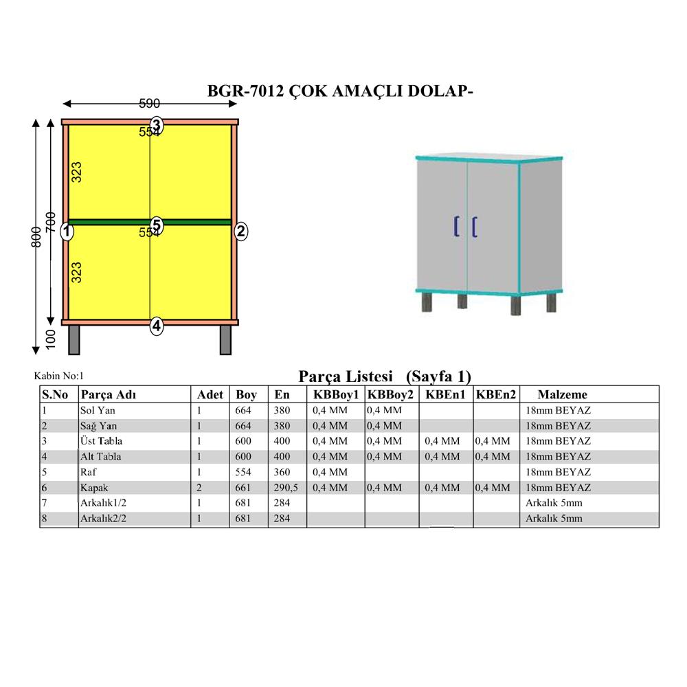BGR 7012 modeli, mutfakta düzeni sağlamak amacıyla tasarlanmış çok amaçlı bir raflı dolaptır. Ürün, beyaz melamin kaplı yonga levhadan üretilmiştir. Yüzeyi çizilmelere ve neme