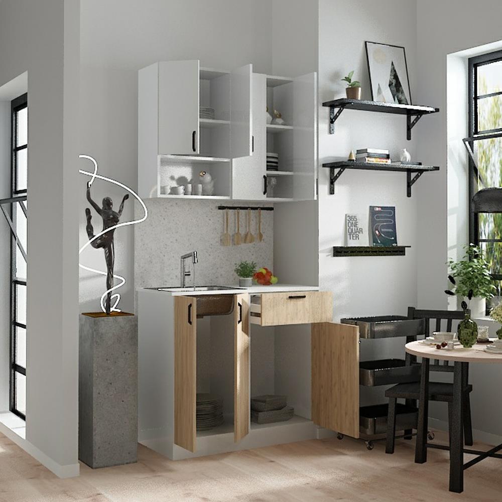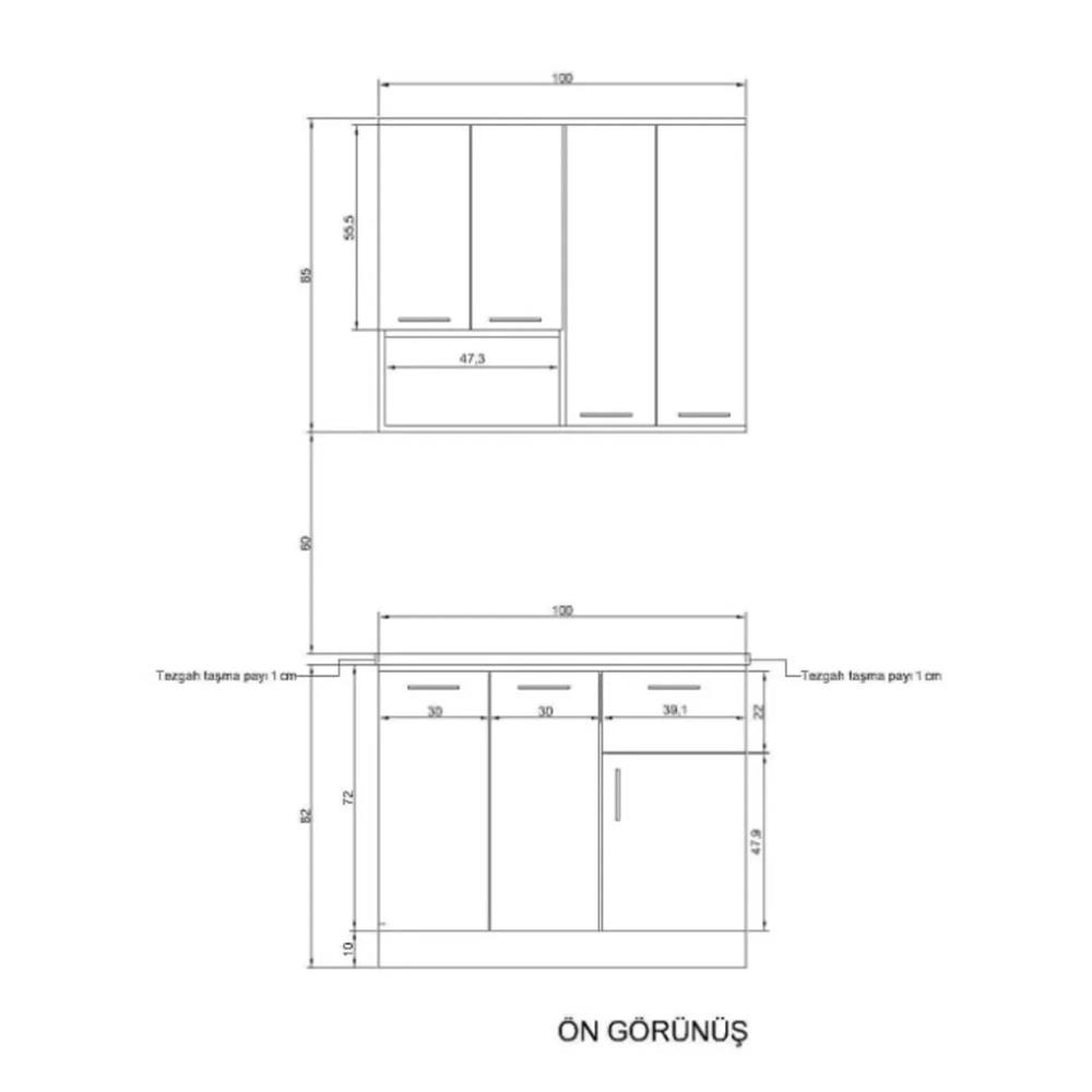 Modern mutfaklar için tasarlanan bu şık mutfak dolabı, beyaz gövdesi ve ahşap detaylarıyla estetik bir görünüm sunar. Alt ve üst modül olmak üzere iki bölümden oluşan bu dolap,