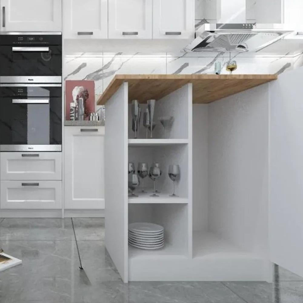 Modern mutfaklar için tasarlanmış bu çok amaçlı dolap, fonksiyonel yapısı ve sade görünümüyle hem kullanım kolaylığı sunar hem de estetik bir katkı sağlar. Mutfak adası olarak