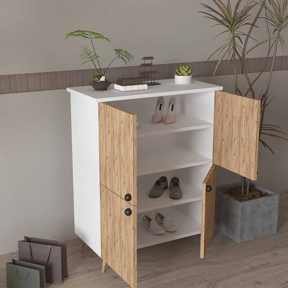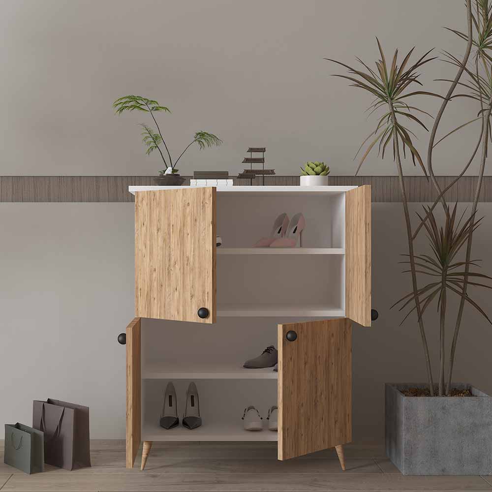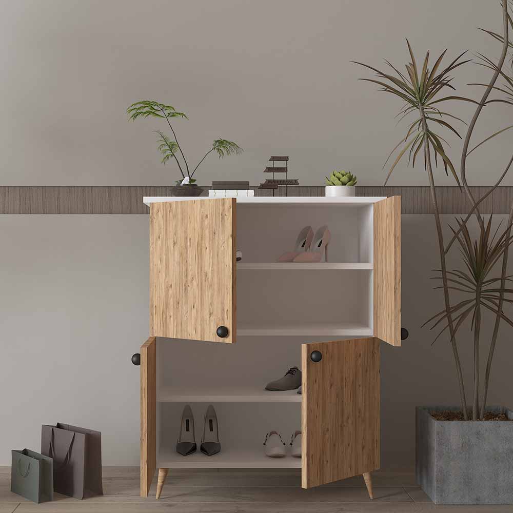 Ayakkabılık BGR 5701, 91 cm yüksekliği, 70 cm genişliği ve 35 cm derinliğiyle kompakt ama kullanışlı bir depolama çözümüdür. Gövdesi beyaz, üst tabla ve detayları ise safir meşe melamin kaplı yonga levhadan üretilmiştir. Kapaklı yapısıyla hem dağınıklığı gizler hem de ayakkabıların tozdan korunmasını sağlar. İç raflı bölmeleri sayesinde çok sayıda ayakkabıyı düzenli bir şekilde saklamaya olanak tanır.