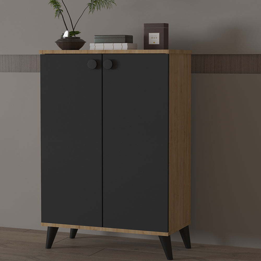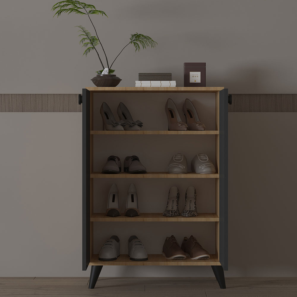 Bu ayakkabılık dolap, melamin kaplı yonga levhadan üretilmiştir. Gövde ve kapaklar antrasit melamin kaplıdır, üst ve alt tablalarda safir meşe melamin kaplama tercih edilmiştir. Melamin yüzey, çizilmelere, lekelere ve hafif darbelere karşı dirençlidir. Günlük kullanımda hijyenik ve uzun ömürlü performans sunar. Nemli bezle kolayca temizlenebilir. Yonga levha gövde ise hem sağlam hem de hafiftir; montaj ve taşıma açısından kullanıcıya kolaylık sağlar.