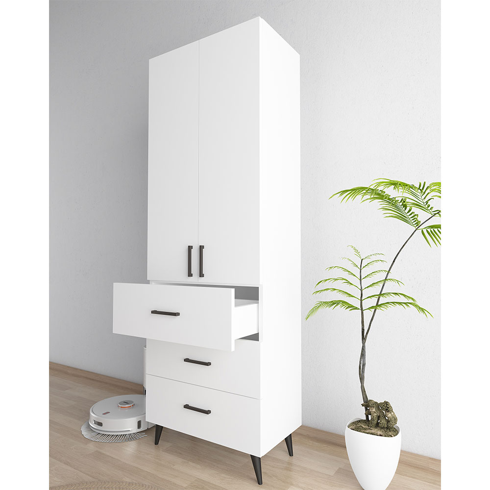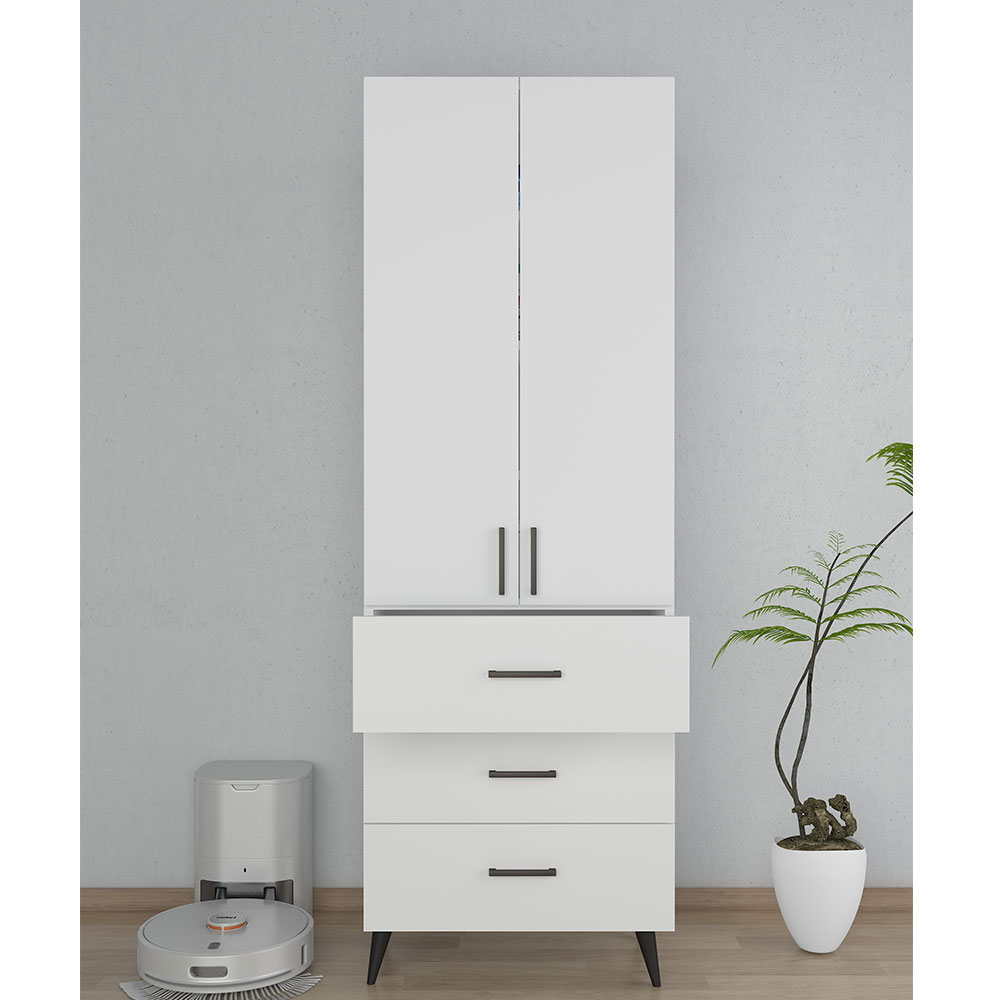 Beyaz dolap modelleri, sade ve nötr renk yapısı ile hemen her dekorasyon stiline uyum sağlar. Modern, klasik ya da minimal iç mekanlara kolayca adapte olur. BGR çok amaçlı dolap 1004 modeli, beyaz melamin kaplaması sayesinde bulunduğu ortama ferahlık ve aydınlık bir görünüm kazandırır. Diğer mobilyalarla uyumlu bir geçiş sağlayarak dekoratif bütünlük sunar. Aynı zamanda alanın daha büyük görünmesine yardımcı olur.