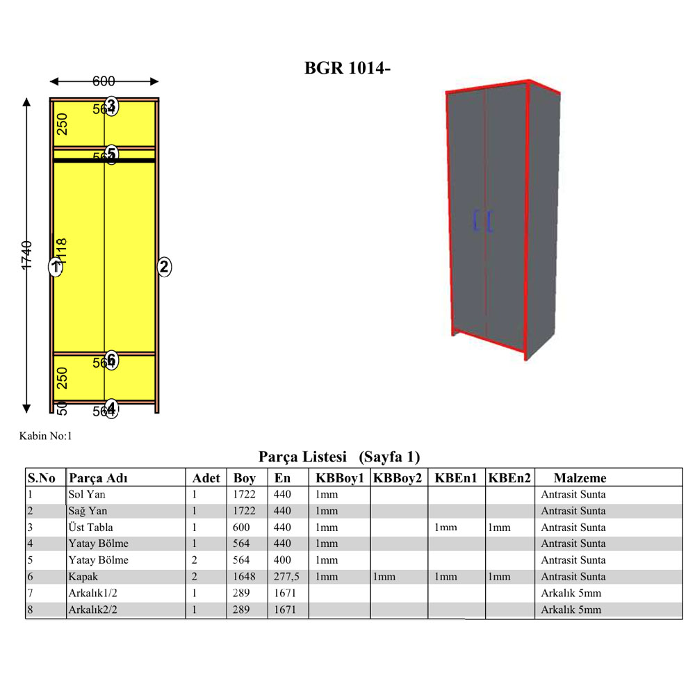 Gardırop BGR 1014 modeli, 174 cm yüksekliği, 60 cm genişliği ve 44 cm derinliği ile kompakt ama kullanışlı bir tasarıma sahiptir. Gövdesi ve kapakları antrasit melamin kaplı yonga levha malzemeden üretilmiştir. İç kısmında askı borusu ve raf bölmesi yer alır. Askılı ve katlanabilir kıyafetlerin düzenli bir şekilde saklanmasını sağlar. Kapaklı yapısıyla eşyaları dış etkenlerden korurken sade ve şık bir görünüm sunar.