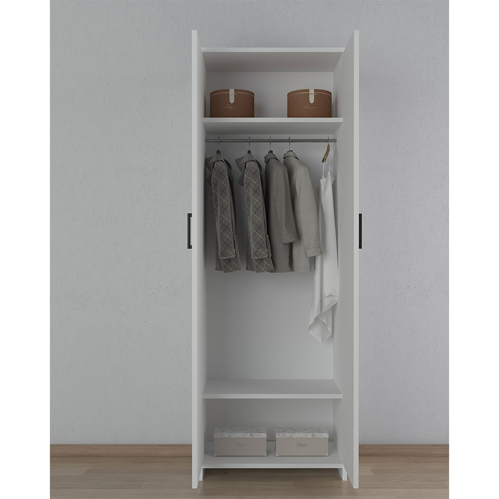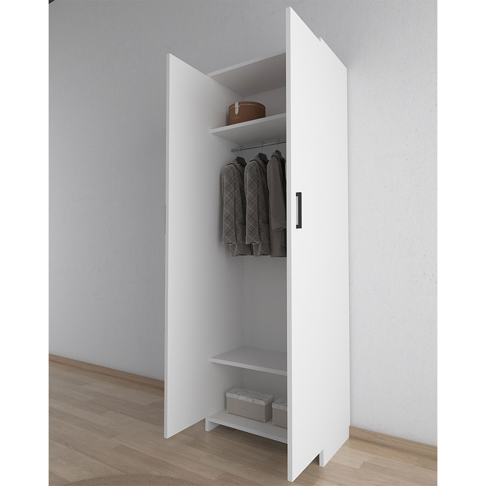 Gardırop BGR 1013, 174 cm yüksekliği, 60 cm genişliği ve 44 cm derinliği ile kompakt ama kullanışlı bir tasarıma sahiptir. Gövdesi ve kapakları beyaz melamin kaplı yonga levha malzemeden üretilmiştir. İç kısmında askı borusu ve raf alanı bulunarak hem askılı kıyafetler hem katlanabilir tekstil ürünleri için uygun depolama alanı sunar. Kapaklı yapısı ile düzeni korur, dış görünümüyle sade ve modern bir çizgi yakalar.