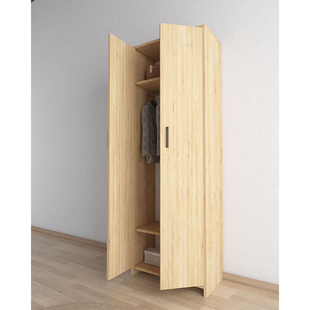 Gardırop BGR 1015, 174 cm yüksekliği, 60 cm genişliği ve 44 cm derinliği ile hem kompakt hem de kullanışlı bir depolama çözümüdür. Gövdesi ve kapakları safir meşe melamin kaplı yonga levha malzemeden üretilmiştir. İç bölümünde askı borusu ve raf alanı bulunur, bu sayede hem askılı hem de katlanabilir giysiler düzenli şekilde yerleştirilebilir. 2 kapaklı sade tasarımı ile hem işlevsel hem de dekoratif bir üründür.