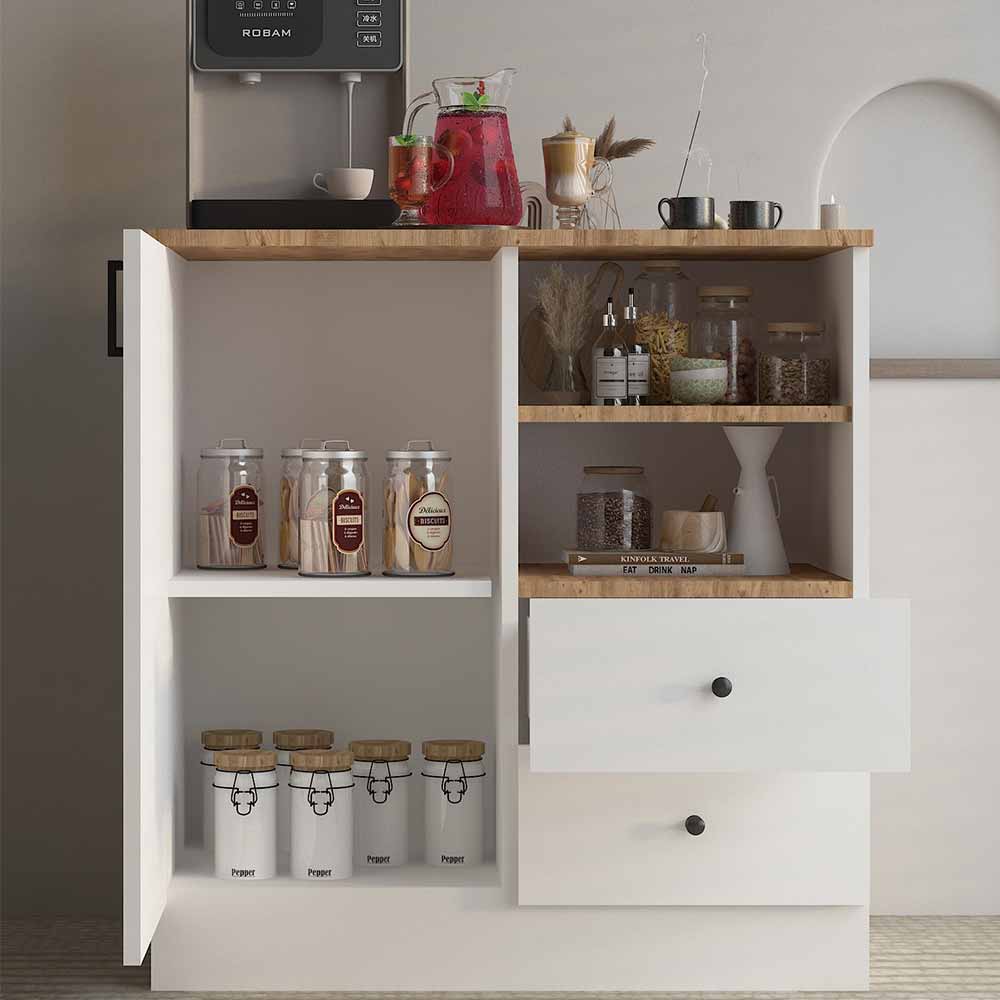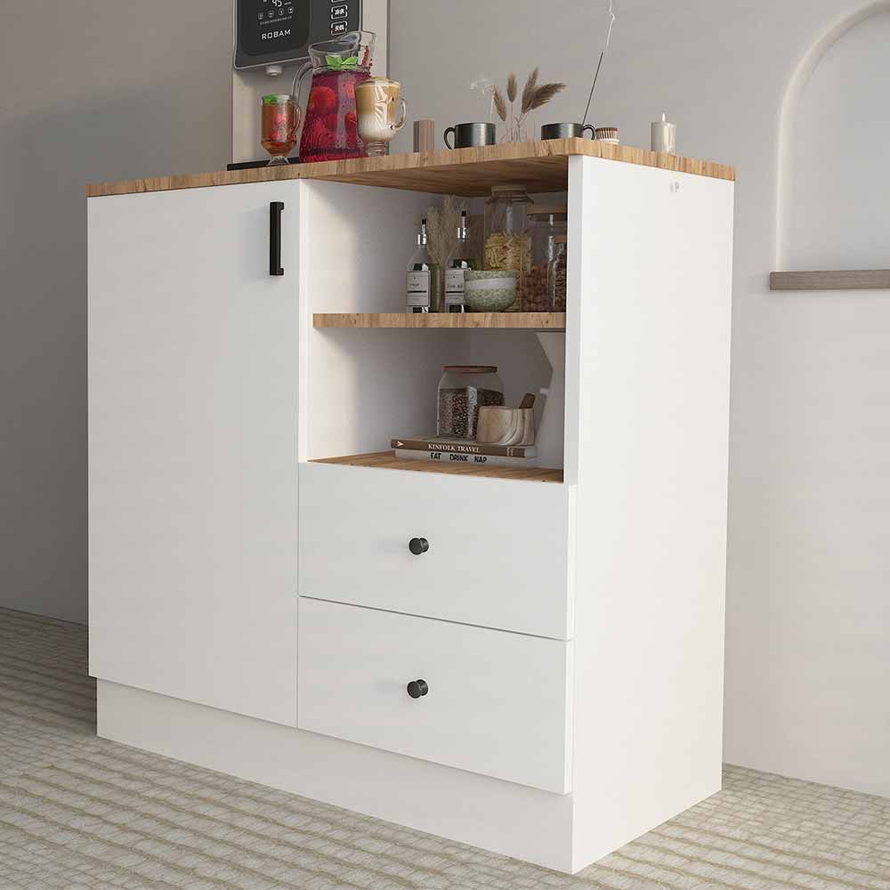 Kahve köşesi BGR 2025, 85 cm yüksekliği, 80 cm genişliği ve 44 cm derinliğiyle ev ve ofislerde kullanım için ideal ölçülere sahiptir. Gövdesi beyaz, kapakları ise safir meşe melamin kaplı yonga levha ile tasarlanmıştır. Düz kapaklı yapısı sayesinde sade ve modern bir görünüm sunar. Üst tabla kahve makinesi, kettle, fincan gibi ürünler için geniş bir yüzey sunarken; alt kapaklı bölüm, çay, kahve ve mutfak malzemeleri için düzenli bir saklama alanı sağlar.