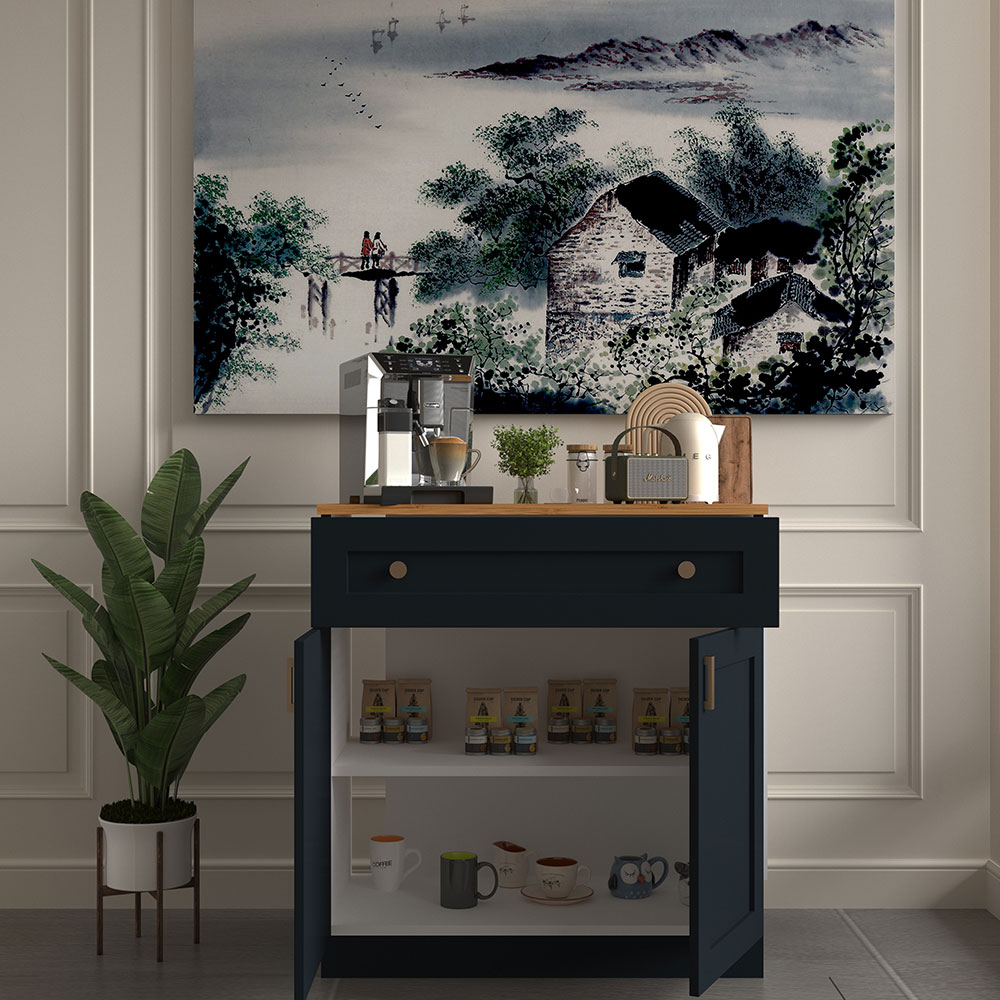 Bu kahve köşesi modeli, evin mutfak bölümünde, oturma odasında veya açık plan yaşam alanlarında rahatlıkla kullanılabilir. Ofis ortamlarında da çalışanlara özel modern kahve istasyonu kurmak için uygundur. 79 cm genişliği sayesinde fazla yer kaplamadan fonksiyonel bir alan sunar. Aynı zamanda kafeterya tarzı ev dekorasyonlarında hem estetik hem de işlevsel bir parça olarak yer bulur. Renk kombinasyonu olan lacivert ve Atlantik çam, hem modern hem klasik mobilyalarla uyumludur. Bu sayede farklı dekorasyon stillerine kolayca entegre edilebilir.