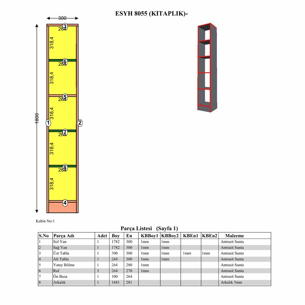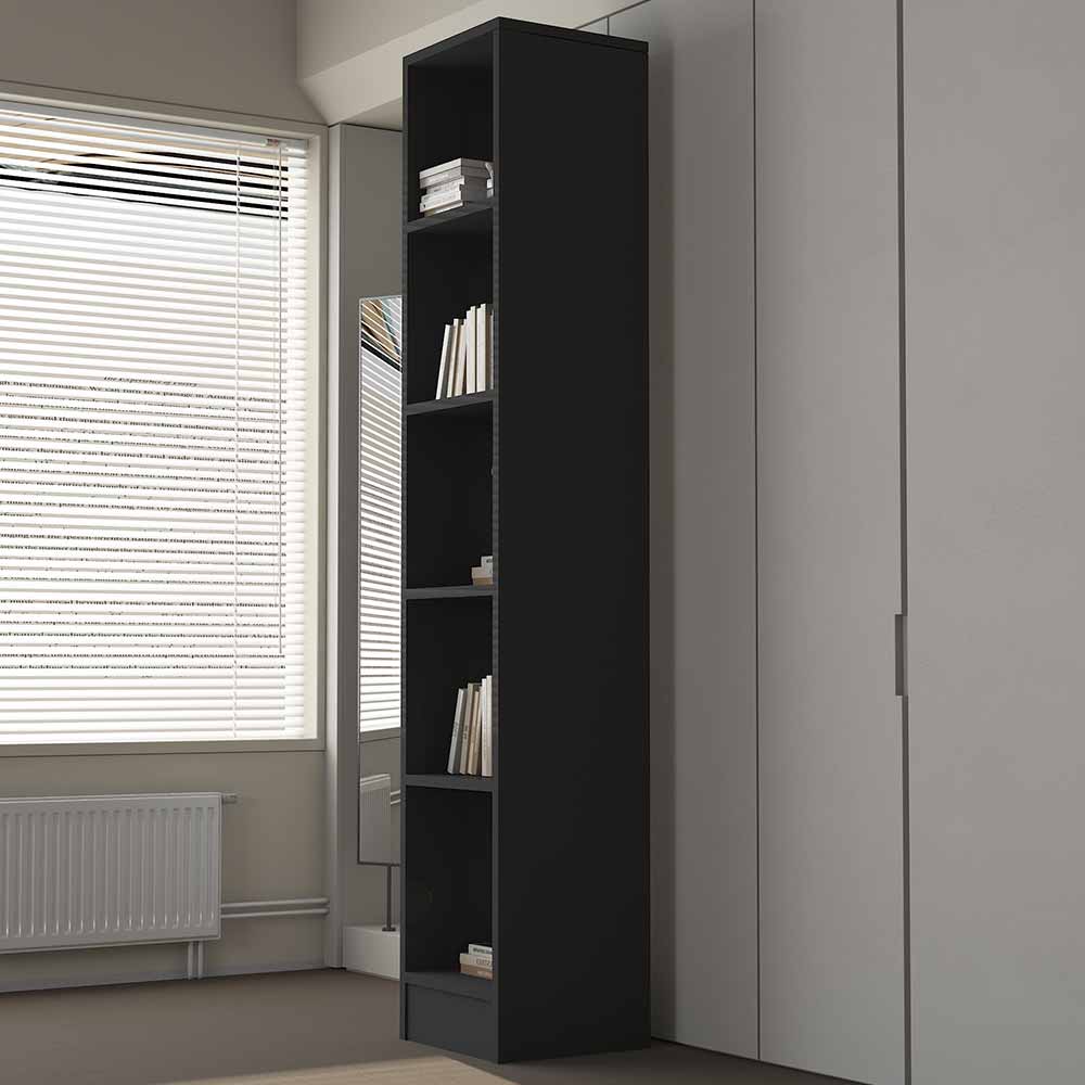 BGR 8055 kitaplık, kaliteli suntalam veya MDF malzeme kullanılarak üretilmiş olup dayanıklı ve uzun ömürlüdür. 5 adet geniş rafıyla dikey kullanım sunar. Raf sistemli kitaplık olarak farklı yükseklik ve derinlikteki eşyalar için uygundur. Antrasit kitaplık yüzeyi çizilmeye ve lekeye karşı dayanıklıdır, temizliği pratiktir. Kompakt yapısı sayesinde hem büyük hem küçük alanlarda kullanılabilir. Minimal çizgileriyle sade ama güçlü bir duruş sergiler.