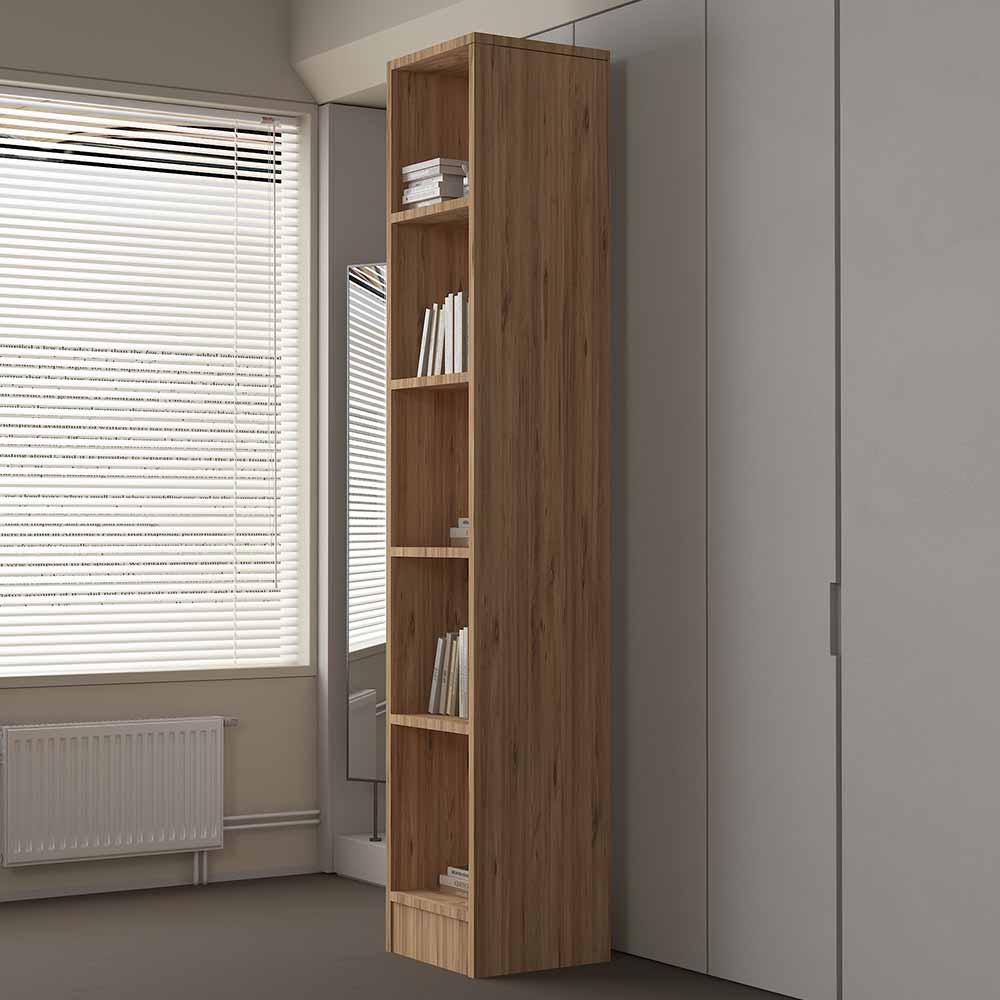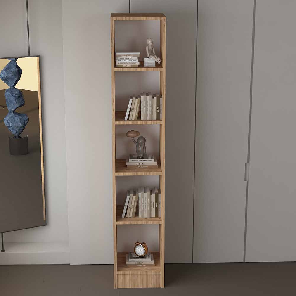 BGR 5 bölmeli kitaplık, kitap, dergi, klasör, dekoratif ürün ve kutu gibi eşyaların düzenli ve estetik biçimde sergilenmesini sağlayan çok amaçlı bir raf sistemidir. Safir meşe kitaplık görünümü, doğal ahşap dokusuyla yaşam alanlarına sıcaklık ve doğallık katar. 8056 kitaplık modeli, sade ve fonksiyonel tasarımı sayesinde hem ev hem ofis kullanımına uygundur. Dikey tasarımı ile yerden tasarruf sağlar, raflar arası genişlik ile farklı boyuttaki eşyaları kolaylıkla yerleştirmeye imkân tanır.