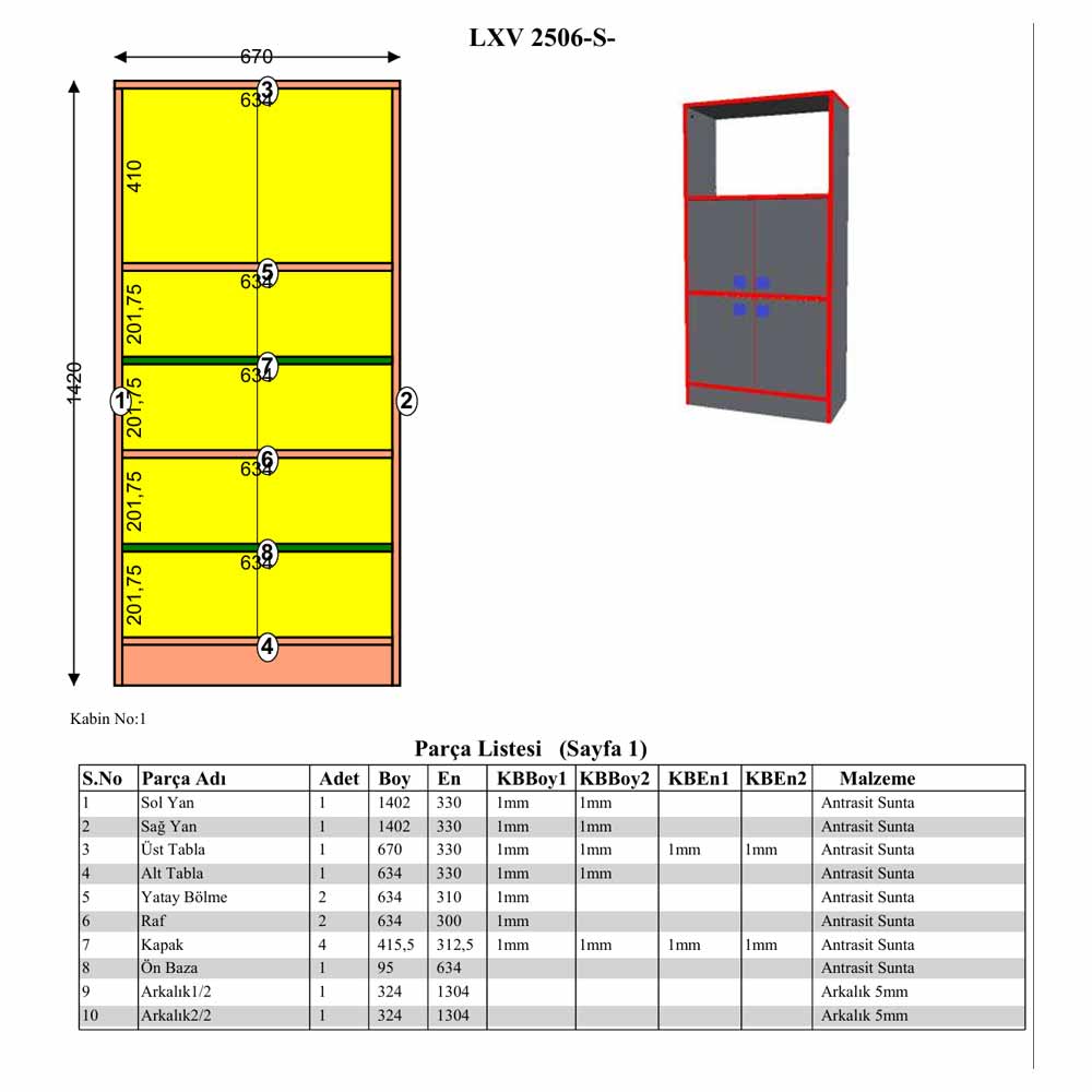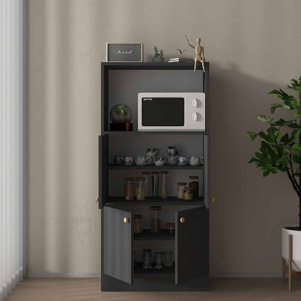 Mutfak dolabı BGR 2506-A, 142 cm yüksekliği, 67 cm genişliği ve 33 cm derinliğiyle dikey kullanım avantajı sunan çok amaçlı bir depolama çözümüdür. Gövdesi tamamı antrasit melamin kaplı yonga levhadan üretilmiştir. Üst kısmında açık raf alanı, alt bölümde ise çift kapaklı geniş bir saklama alanı yer alır. Geniş iç hacmi sayesinde hem günlük kullanım ürünlerini hem de fazla eşyaları organize etmenizi sağlar.