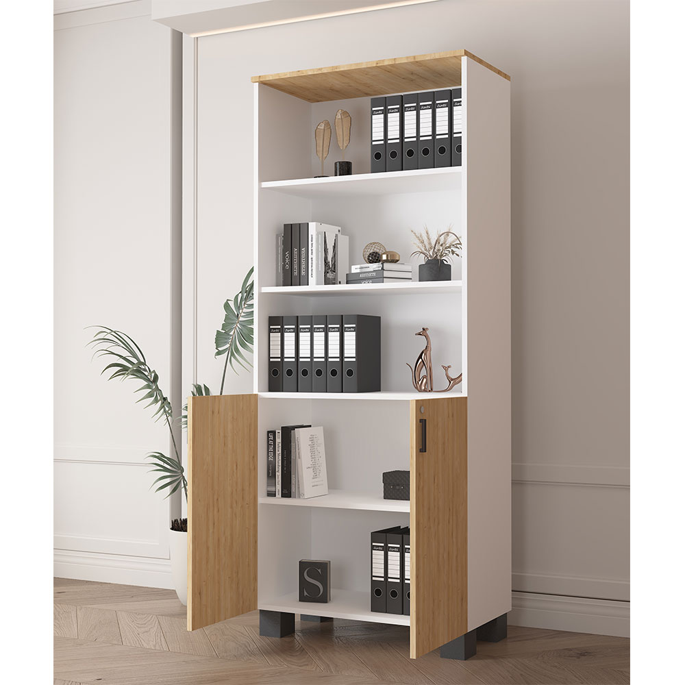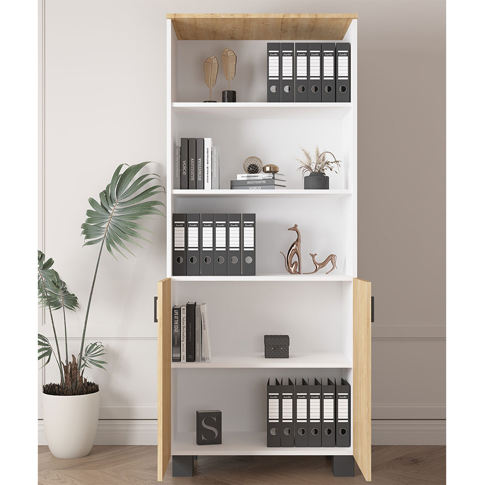 Bu ofis dosya dolabı, kurumsal ofislerde, muhasebe departmanlarında, hukuk bürolarında, okul ve eğitim kurumlarında ya da ev-ofis ortamlarında kullanılabilir. 190 cm yüksekliği sayesinde geniş arşivleme ve depolama ihtiyacı olan kullanıcılar için idealdir. Hem açık raf düzeni hem de kapaklı bölmeleriyle hem gizli hem de erişimi kolay saklama sunar. Çok raflı dolap yapısı sayesinde belgeler, kutular, dosyalar ve ofis ekipmanları düzenli şekilde yerleştirilebilir. Beyaz ve safir meşe rengi, profesyonel ama samimi bir görünüm kazandırır.