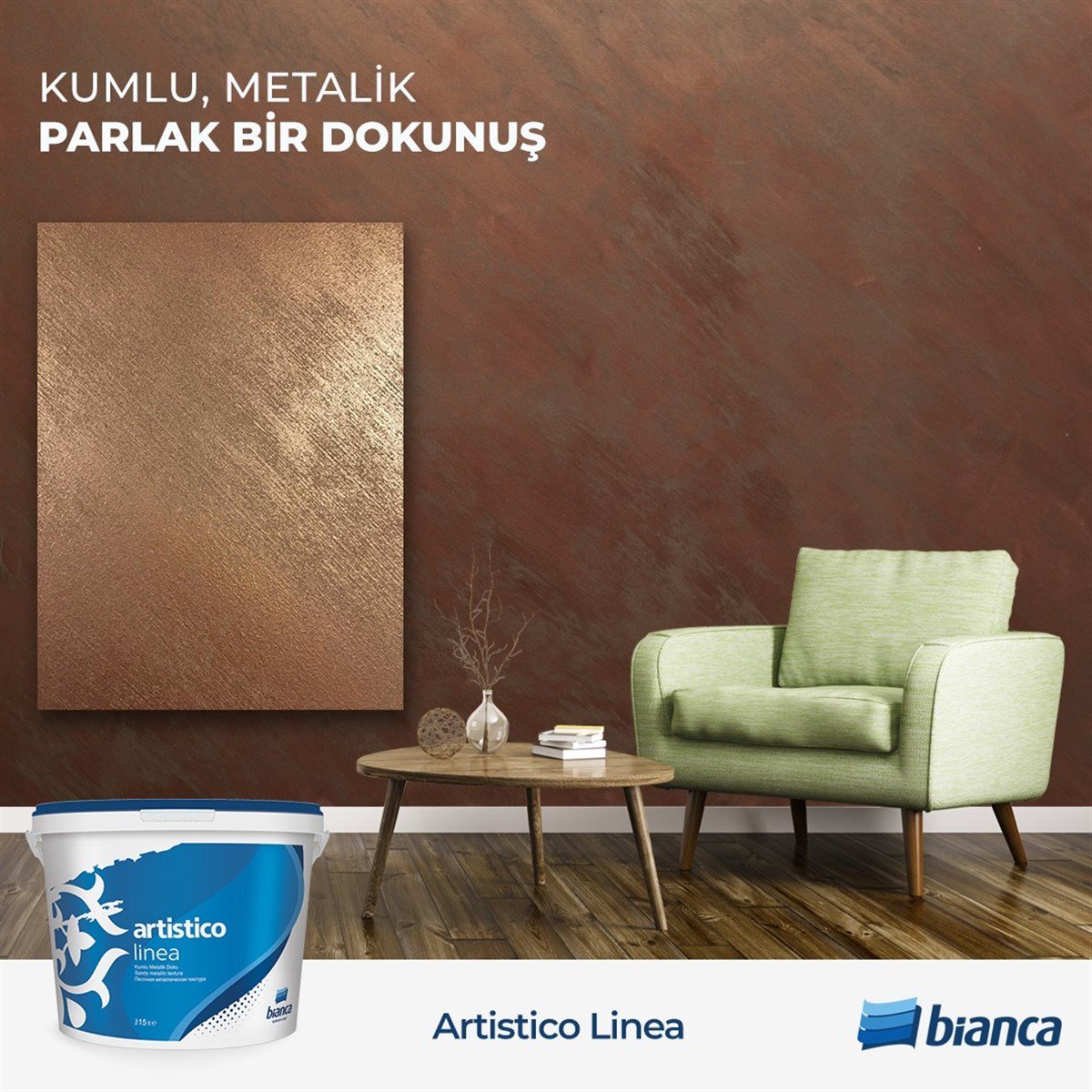Bianca Artistico Linea inceltilmeden dekoratif fırça yardımı ile isteğe göre yatay, dikey ya da çapraz desen verilerek yüzeye uygulanır. Kurumaya yakın temiz ve kalın bir fırça ile kumların üzerindeki sıvı kısım fırça hafif bastırılarak alınır. Böylece kumlar mat görünüm alırken alt zemin parlak bir görüntü kazanmış olur.