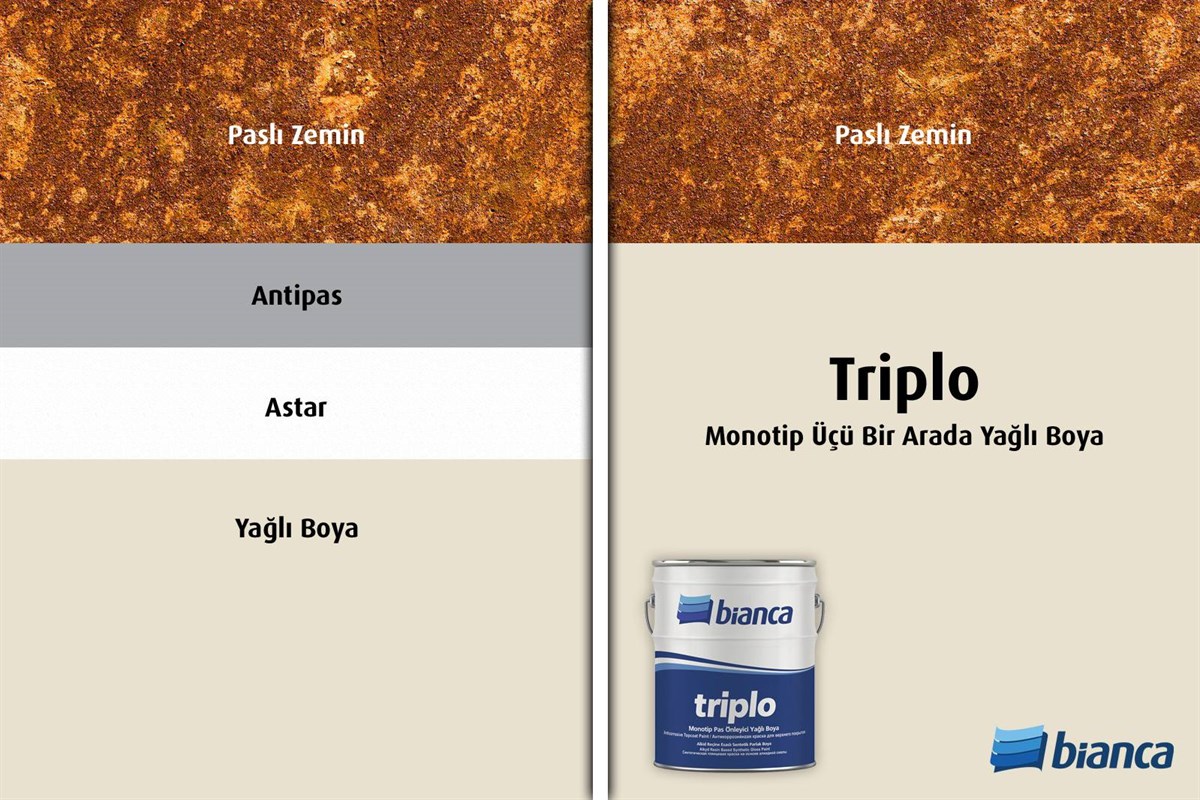 Uygulanacak yüzeyler, yağ, pas, toz v.b. kirliliklerden arındırılmış olmalıdır. Paslı yüzeylere kumlama, tel fırça ile fırçalama ve silme işlemleri yapılmalıdır. Uygulama sırasında yüzey ve ortam sıcaklığının +5ºC ile +30ºC arasında olmasına dikkat edilmelidir. Bianca Triplo – Monotip Yağlı Boya uygulanacak eski ve yeni metal yüzeyler ilk defa boyanacak ise parlak yüzeye kadar zımpara yapıldıktan sonra yüzeydeki yağ ve kirlilikler sentetik tiner ile yüzeyden uzaklaştırılmalı ve hemen Bianca Triplo – Monotip Yağlı Boya ile bir veya iki kat boyanmalıdır.
