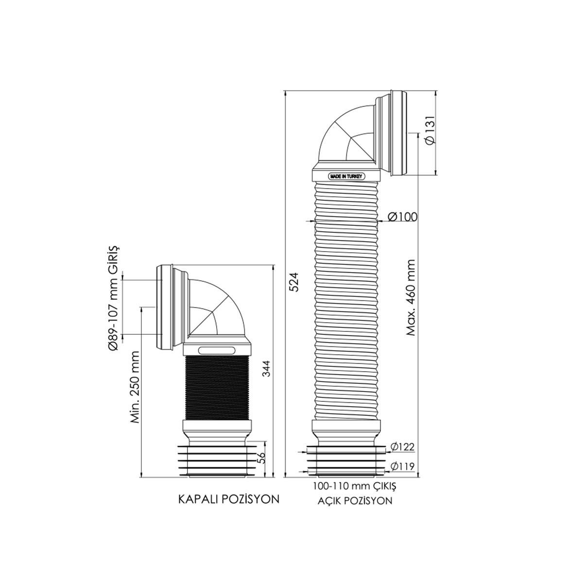Arkadan çıkışlı klozetlerin yerden çıkışlı pis su tesisatına bağlanmasını sağlar. Körüklü ve esnek yapısı sayesinde, duvara sıfır bağlantı ve eksen kaçırmayı mümkün kılar.
