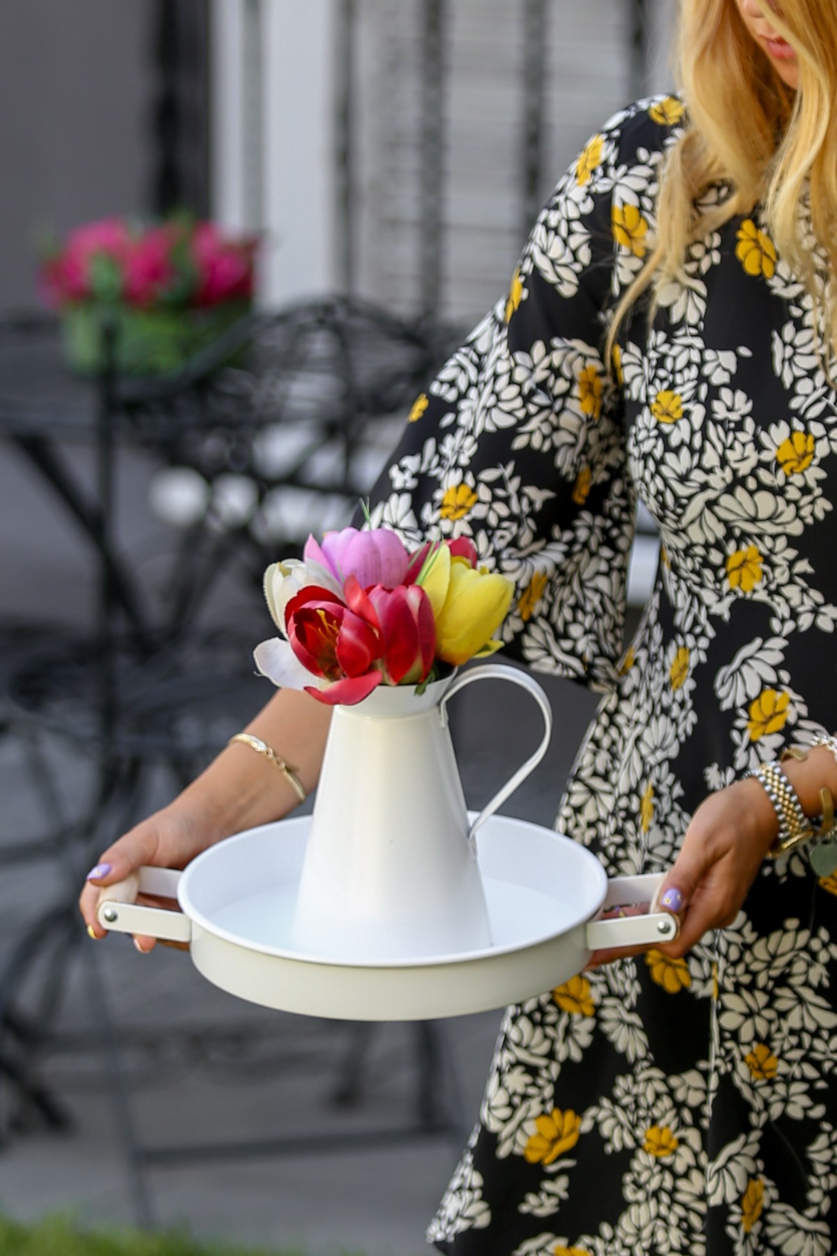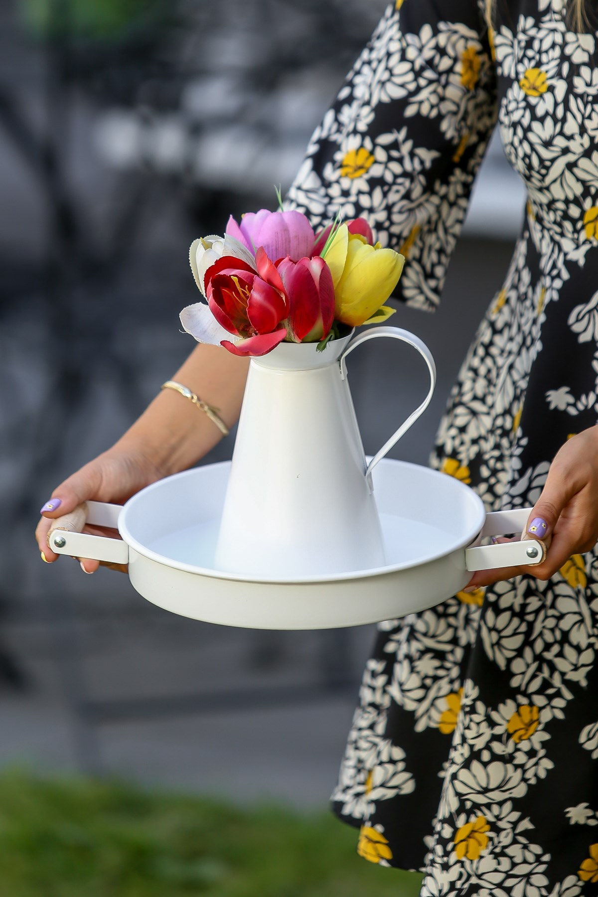 İster canlı çiçeklerinizi koyabileceğiniz ister yapay çiçeklerinizi koyabileceğiniz beyaz metal vazo. İster salon masalarınızda istersenizde içecek servislerinizde kullanabileceğiniz metal tepsi. Tahta tutcakaları sayesinde kolaylıkla servis edebilirsiniz.