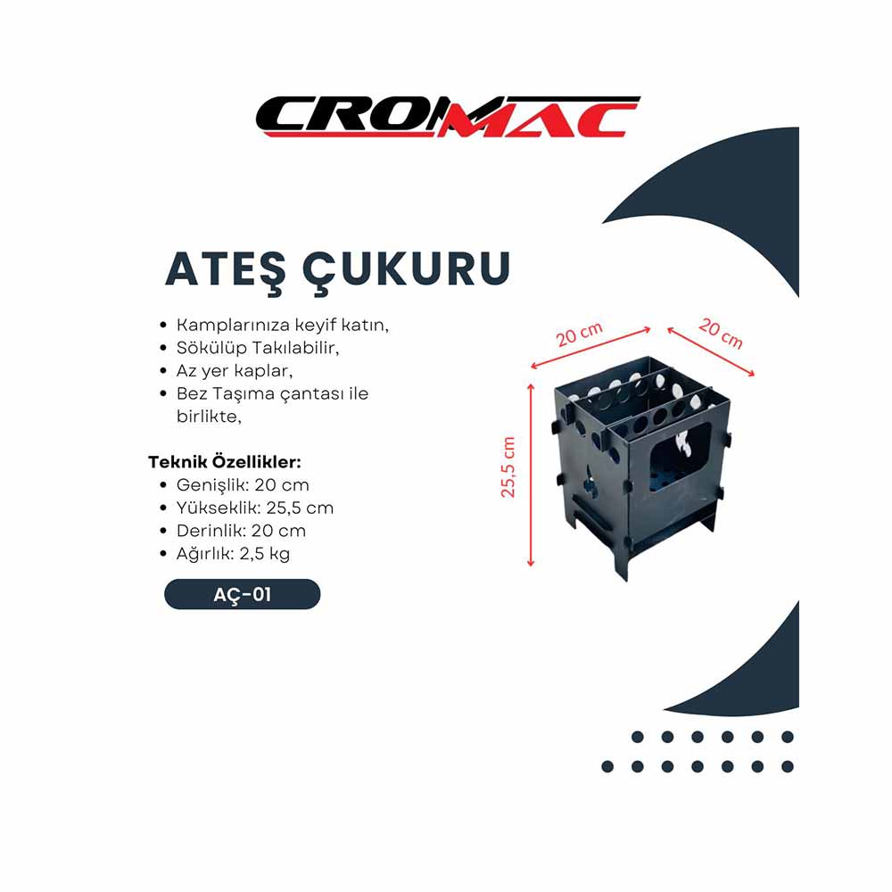 Portatif ateş kutusu, klasik kamp ateşlerine göre hem daha güvenlidir hem de daha düzenli yanma sağlar. Crommac AÇ-01, sökülebilir yapısı sayesinde taşıması ve saklaması kolaydır. Ürün az yer kaplar, kamp çantasına rahatlıkla sığar. Çevreye zarar vermeden ateş yakma olanağı sunar. Isı yalıtımı sayesinde altında zemine zarar vermez.