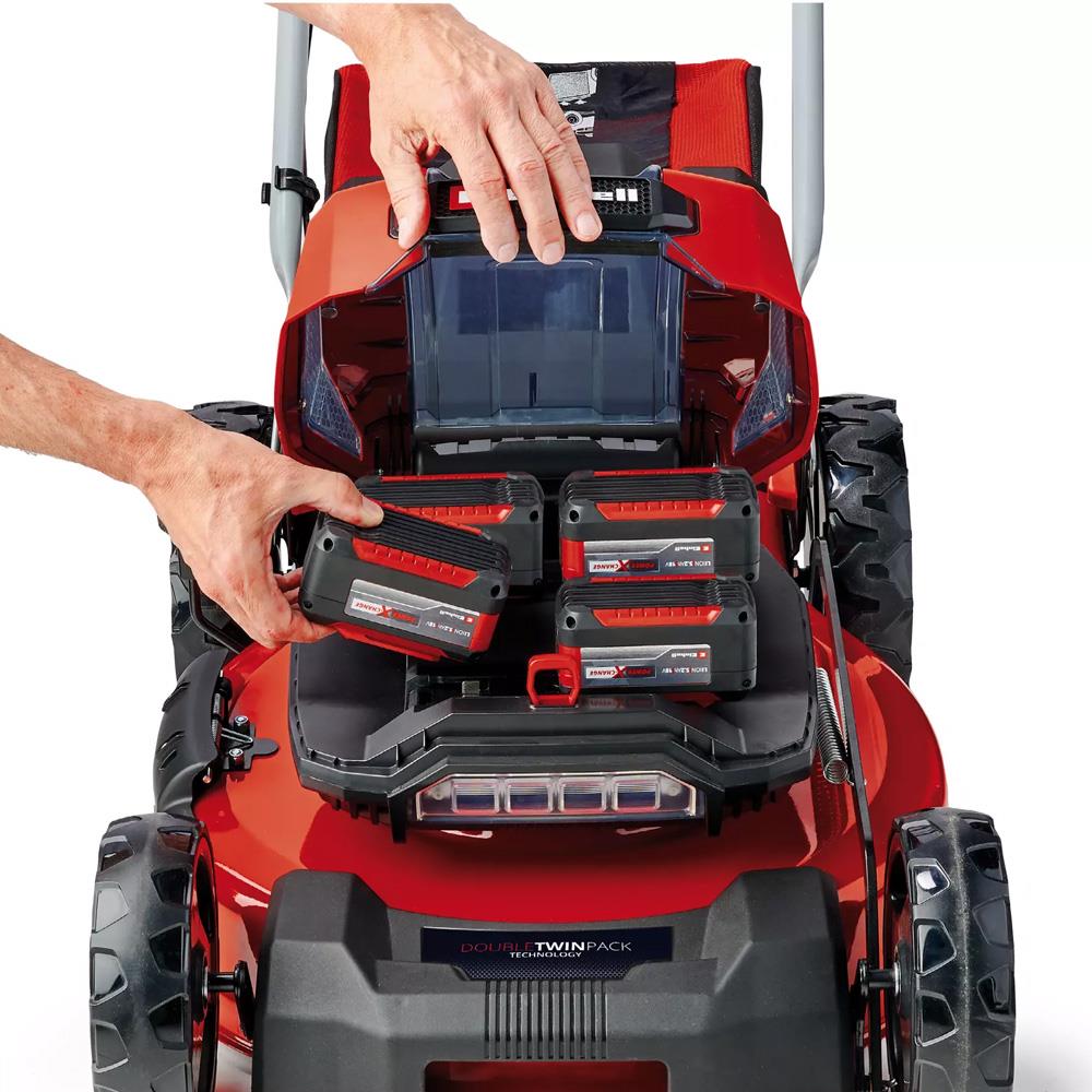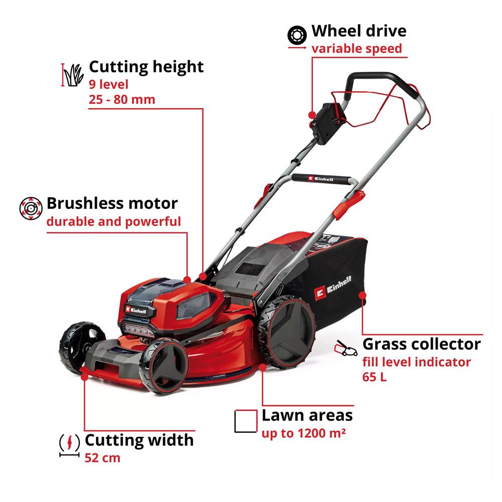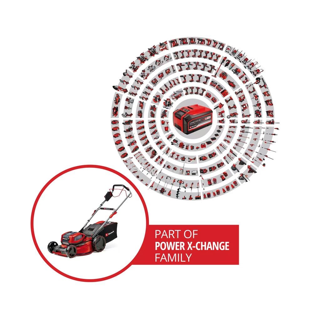 Einhell GP-CM 36/52 S Li BL, Power X-Change sistemine sahip, güçlü ve verimli bir akülü çim biçme makinesidir. 52 cm'lik geniş kesim genişliği ve 4 adet 5.2 Ah