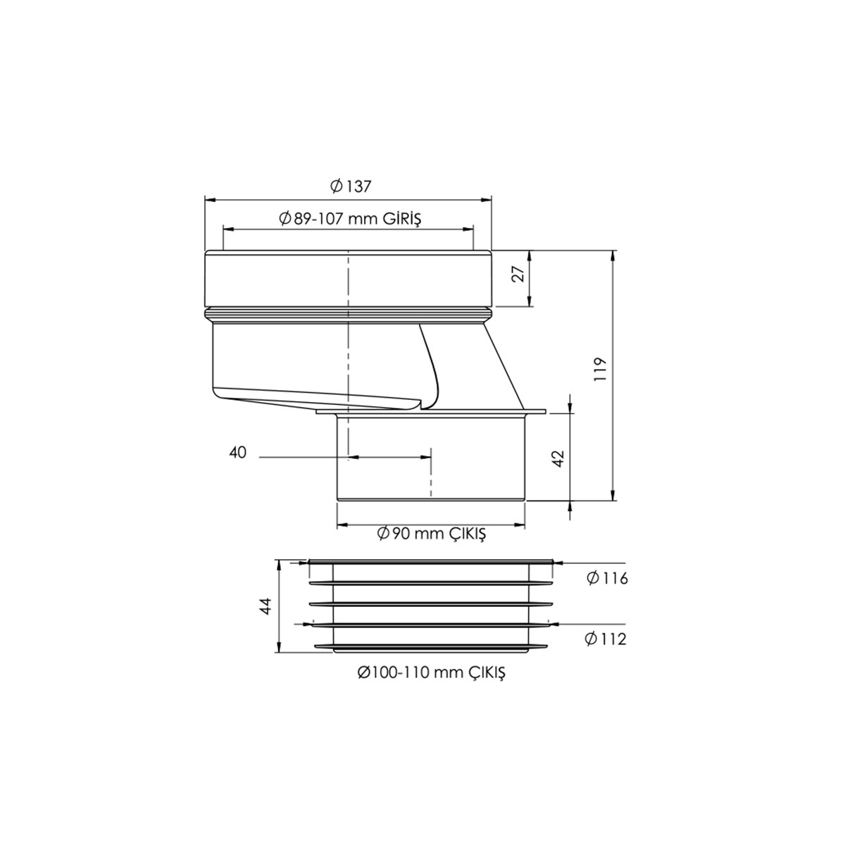 Alttan çıkışlı klozetlerde pis su çıkışlarını tesisata bağlamak için kullanılır. Klozette 40mm. eksen kaçırma sağlar.