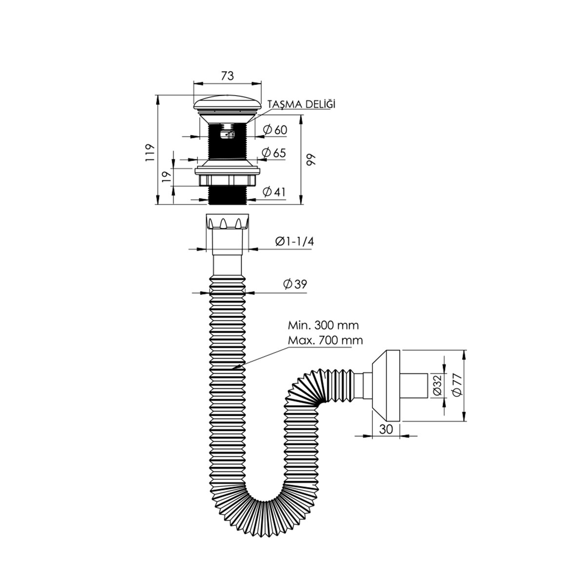 Esnek körüklü gider borusu sayesinde, hızlı bağlantı yapılabilir.