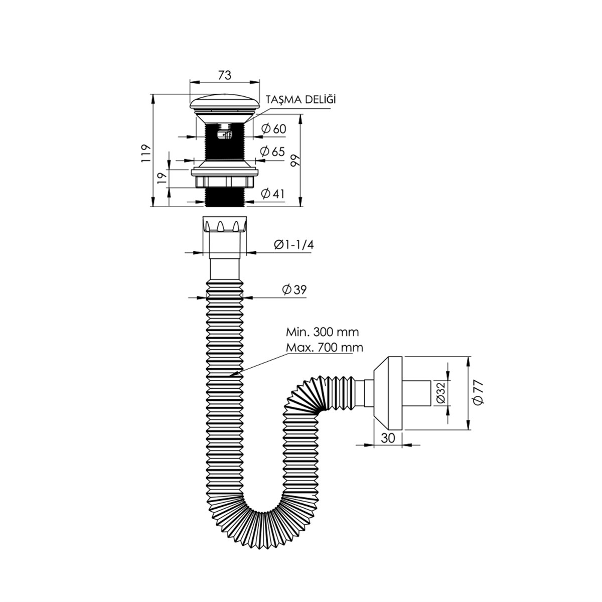 Elixir Pop Up Sifon Seramik Başlıklı Parlak Siyah ve Körüklü Gider Borusu Taşma Deliksiz