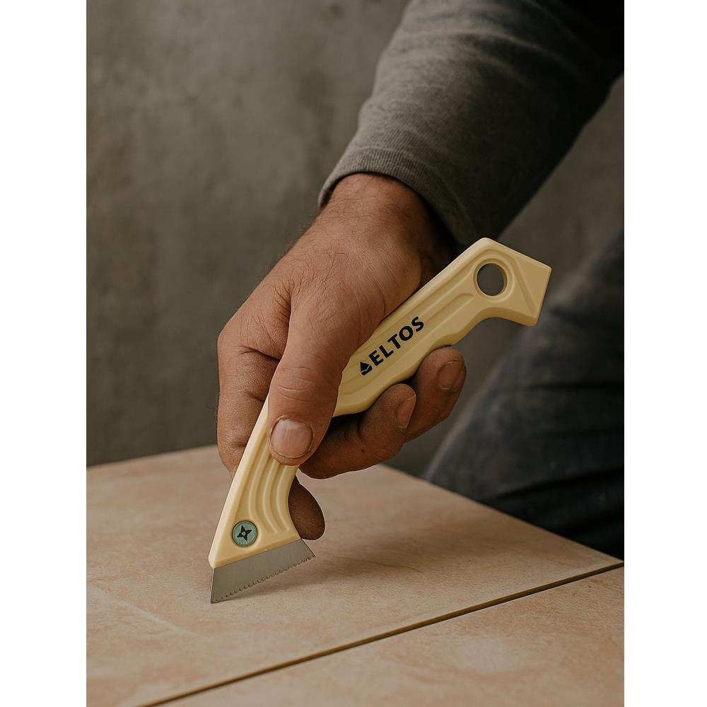 Eltos Derz Kazıyıcı EDK001, fayans ve seramik aralarındaki eski, çatlamış ya da kirlenmiş derz dolgularını temizlemek için tasarlanmış pratik ve dayanıklı bir el aletidir. Manuel