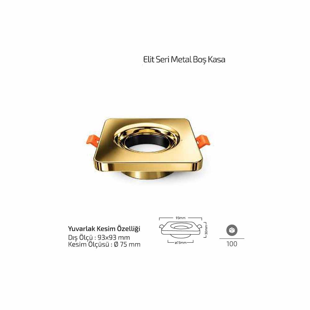 Forlife Elit Metal Boş Spot Kasa Altın FL-1903 A, sıva altı spot aydınlatma sistemleri için tasarlanmış dayanıklı ve dekoratif bir spot kasa modelidir. 93x93 mm dış ölçüsü ve 75 mm kesim çapı sayesinde birçok LED spot ve spot armatür ile uyumlu şekilde kullanılabilir.