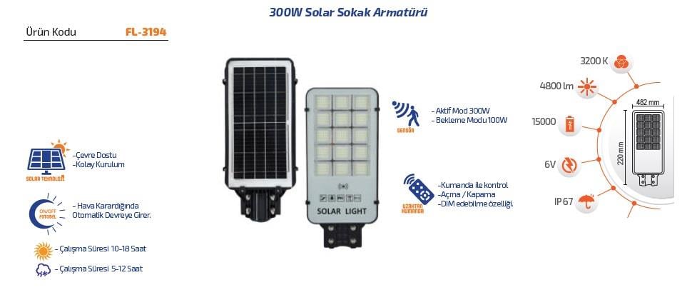 Forlife Solar Sokak Lambası 300W 3200K Gün Işığı FL-3194