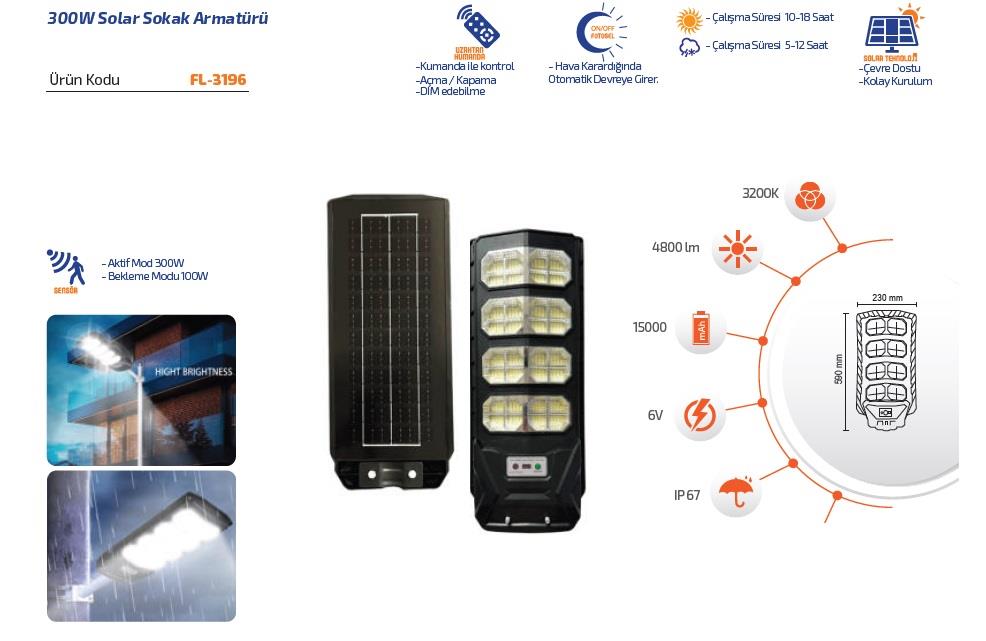 Forlife Solar Sokak Lambası 300W 3200K Gün Işığı FL-3196