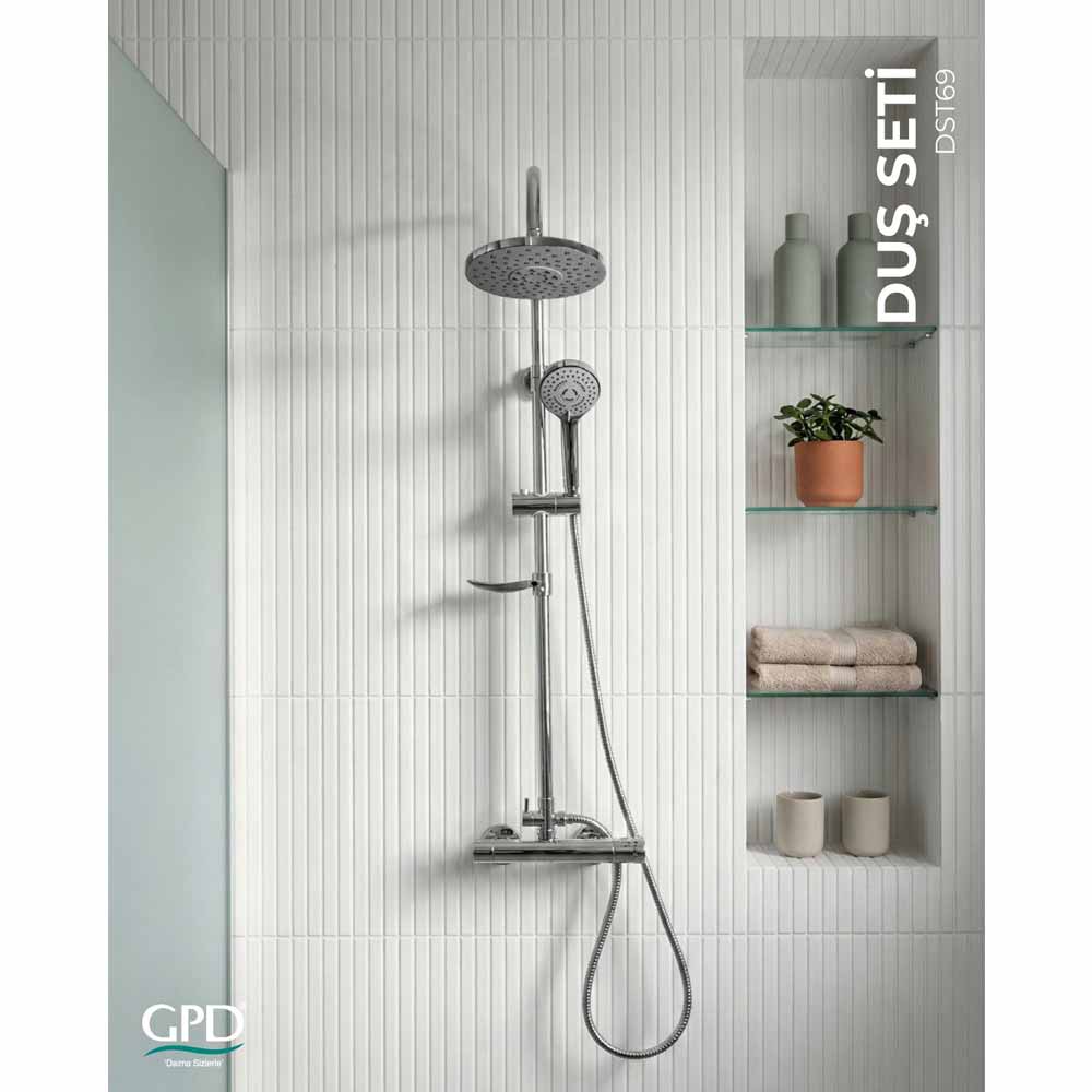 GPD DST69, banyonuzda hem şıklık hem de mükemmel bir duş deneyimi sunmak için tasarlanmış bir duş setidir. 3 fonksiyonlu el duşu, Ø200 mm tepe duşu ve MDU165