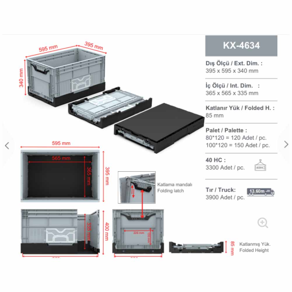Kullanılmadığı zamanlarda kolayca katlanarak depolanabilir; böylece raf ve zemin alanında düzen sağlar. Dolu kullanımda ise sağlam gövdesi ile güvenli taşıma ve istifleme imkânı sunar.