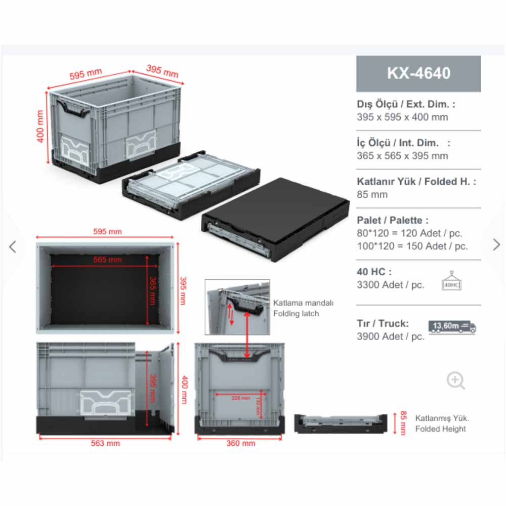 Hipaş Katlanır Kasa KX-4640, depo, lojistik ve ticari alanlarda pratik depolama ve taşıma ihtiyacı için geliştirilmiş dayanıklı bir çözümdür. 40x60x40 cm ölçüleri ile ürünlerin düzenli şekilde istiflenmesini sağlar.