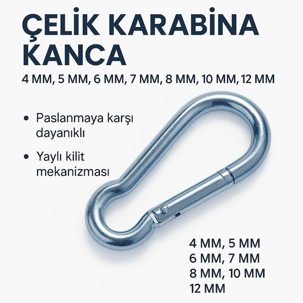 karabina kanca, çelik karabina, yaylı karabina, galvanizli kanca, metal kanca, kamp kancası, halat kancası, e-ticaret karabina, karabina 4 mm, 5 mm karabina, 6 mm yaylı kanca,