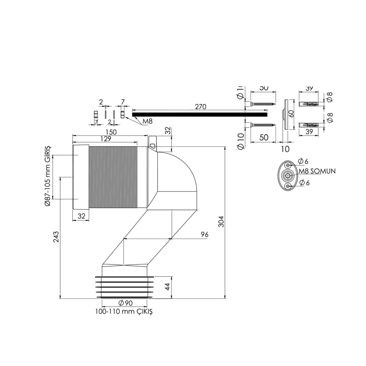 Arkadan çıkışlı klozetleri yer tesisatına bağlamak için kullanılır. Kesilerek boyu ayarlanabildiğinden, duvara sıfır klozetlerde klozetin duvara tam yanaşmasına imkan sağlar.