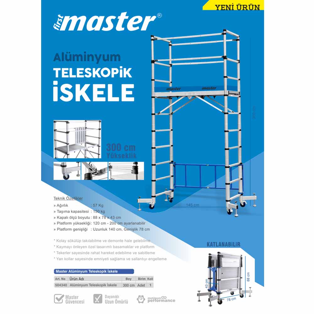 Master Teleskopik İskele Katlanabilir Alüminyum 300 cm 504340, yüksek alanlarda güvenli ve konforlu çalışma imkanı sunan profesyonel bir platform sistemidir. Ayarlanabilir platform yüksekliği sayesinde farklı işlerde esnek kullanım sağlar.