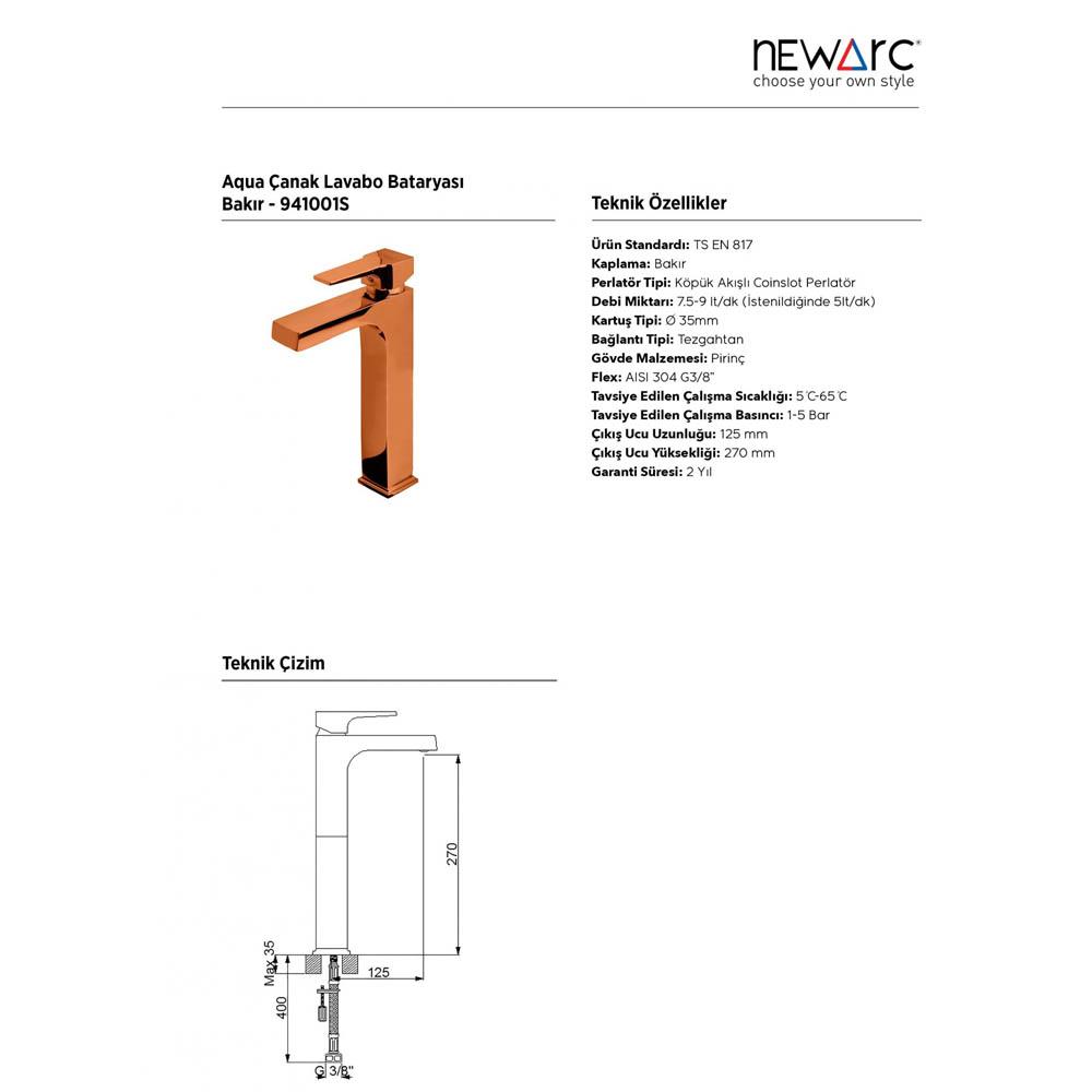 Newarc Aqua Çanak Tipi Lavabo Bataryası Parlak Bakır 941001S