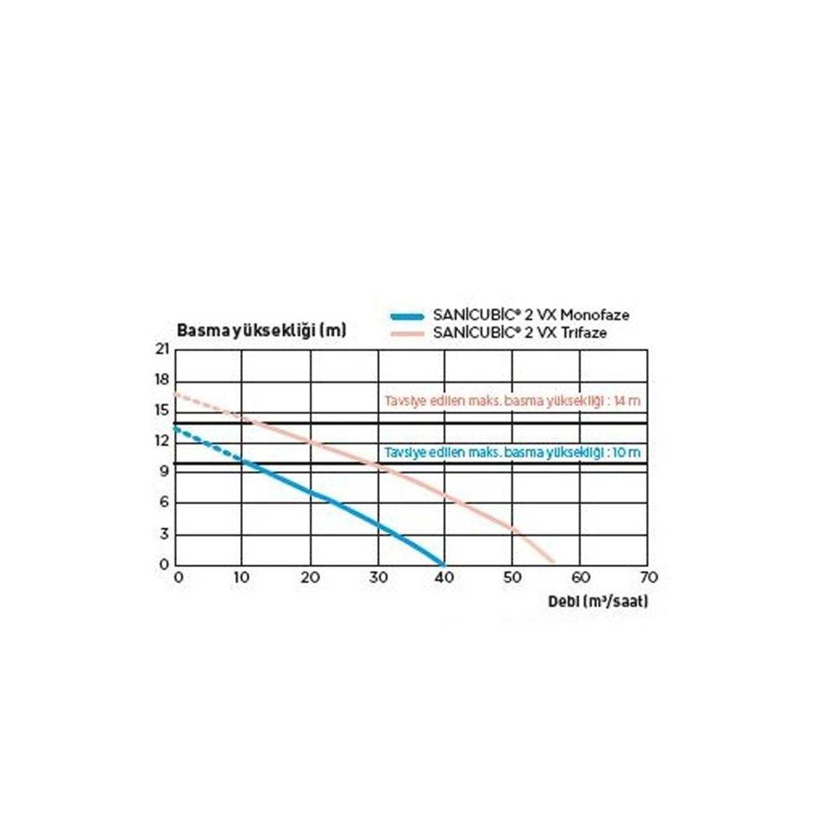 Sanicubic 2 VX monofaze, foseptik suları dikey maksimum 10 metre'ye kadar tahliye edebilmektedir.