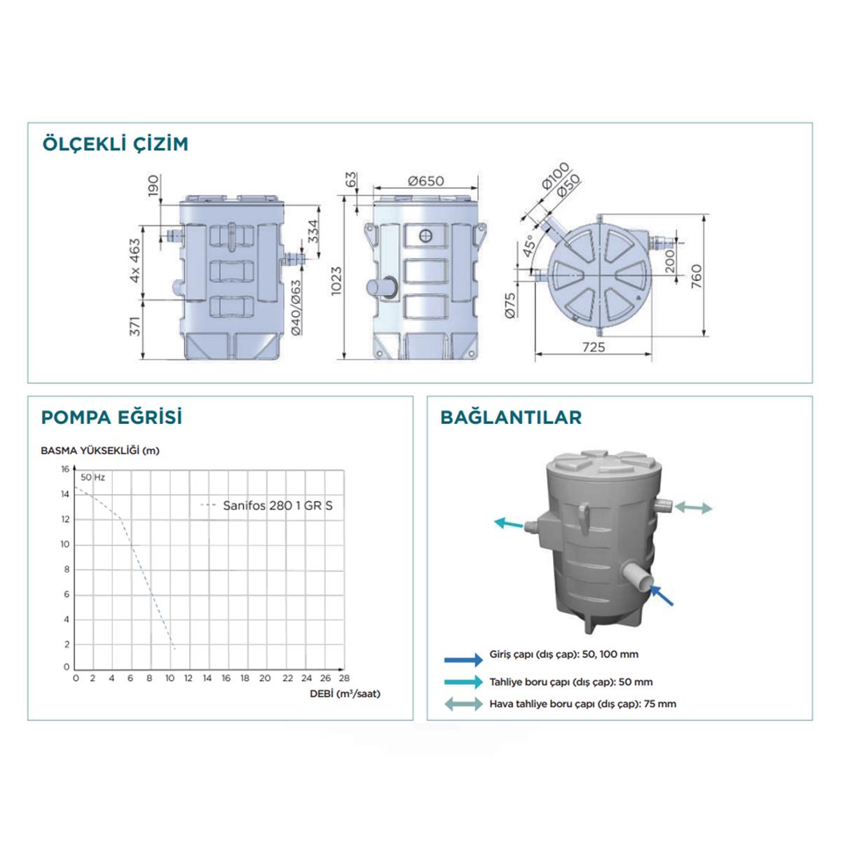 Sanifos 280, ProX K2 parçalayıcı bıçağa* sahip, montaja hazır tahliye aksamları, motor kablosunun çıkışı için kablo rakoru, çek valf, küresel vana, dalgıç tip pompa ile birlikte teslim edilir. Opsiyonel olarak şamandıra ile çalışan kablosuz alarm modülü temin edilebilir. 3 adet delme alanı mevcut. Ayrıca montajı kolaylaştırabilecek 40 cm’lik yükselti, aksesuar olarak temin edilebilir.
