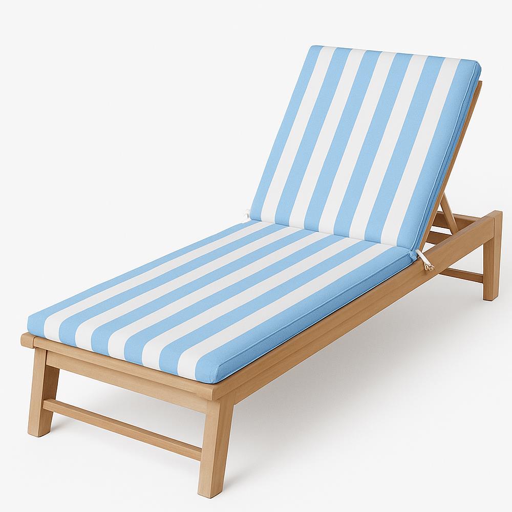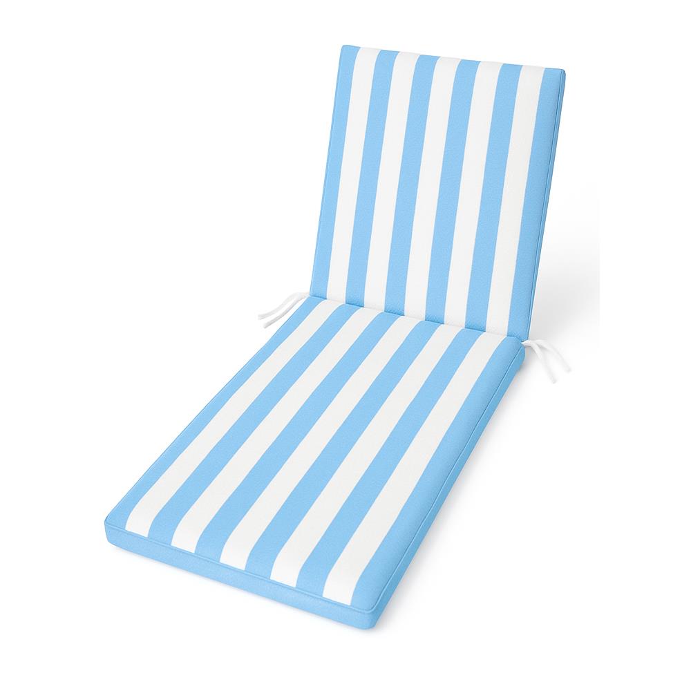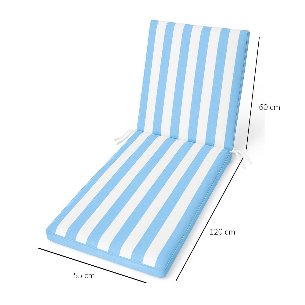 Bu şezlong minderi, su tutmaz kumaşı ve kullanışlı tasarımıyla hem estetik hem de konfor sunar. Mavi-beyaz çizgili yapısı, açık alanlara ferah bir görünüm kazandırır. Fermuarlı